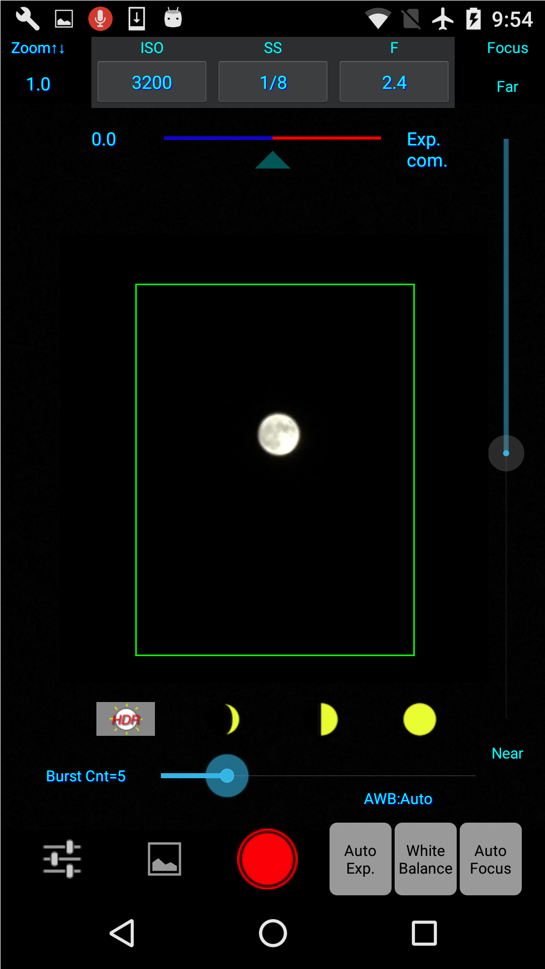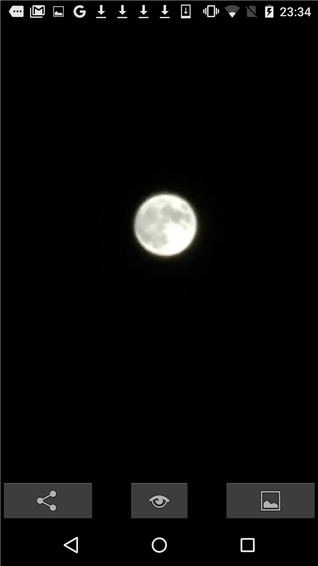 The zooming factor is expanded more than the original so that you can catch the small moon in close-up on the screen. You can do zooming by flicking the screen up and down. It utilizes the hand-operated control function of the camera and allowed you to take pictures of the bright moon in the night sky with appropriate brightness by turning down exposure. In addition, it makes the pattern on the moon clear by emphasizing black parts with combining the plural images after consecutive shots. It has HDR function for daytime photographs, and you can take pictures easily with high dynamic range by changing the number of the consecutive shots and composition sheets. You can use more than 40 kinds of filters which make various effects to the photographs. You become able to use all functions by purchasing a paid version. This app functions are as follows. (1) Photography function for a crescent moon, a waxing moon and a full moon. It combine the plural images of the consecutive shots of the moon in the night sky into one high-definition image using the most suitable multiple exposure technique. It sets each exposure in response to a crescent moon, a waxing moon or a full moon appropriately. (Darken exposure) It combines photos of 1-3 times of consecutive shots into one. (Some models might not be able to set adequate exposure level) (2) HDR function It combines photos of consecutive shots changing exposure with each timing into one piece of photo which has artificially expanded dynamic range. You can set the number of consecutive shots to 1-20. (3) Camera function ・Indication of exposure information It displays ISO level, shutter speed and aperture stop in real time. (Some models do not display them) ・White balance setting In addition to automatic setting, you can set the white balance corresponding to the conditions such as incandescent, daylight, shade, etc. ・Zoom function You can zoom in or out by flipping down or up action. In addition to the maximum zoom magnification that the camera permits, it independently enlarges zoom magnification. In this case, it surrounds the zoom area with green frame lines and let you know easily a zoom position at the whole. ・Resolution You can select all resolution that a camera has. (Only in the paid version) (4) Other functions ・Shake correction It minimizes the position displacement in combining the plural images at the consecutive shots. ・Gallery The photographs taken by this app are stored in the storage and you can see the list of them on a list screen. (Only in the paid version) You can delete the image by tapping an ✖️icon and choosing images, then tapping a trash box icon. ・Image processing When you tap a thumbnail, the image will be enlarged. When you tap an editing icon here, it displays a list of filters for image processing. This app has about 40 filters such as 'Brightness','Contrast','Blur','Sharpening','Sepia','Monochrome','Edge detection', 'Sketch' and so on. Select a filter from these filters and you can do actual processing to the image on the screen by the selected filter. The image processed can be stored in the storage, then you can do another processing subsequently. ・Share function You can share photographs through email or various SNS. *** This app includes the following open sources. ・openCV(Copyright (C) 2000-2015, Intel Corporation, all rights reserved.; Copyright (C) 2009-2011, Willow Garage Inc., all rights reserved.; Copyright (C) 2009-2015, NVIDIA Corporation, all rights reserved.; Copyright (C) 2010-2013, Advanced Micro Devices, Inc., all rights reserved.; Copyright (C) 2015, OpenCV Foundation, all rights reserved.; Copyright (C) 2015, Itseez Inc., all rights reserved.) ・GPUImage for android(Copyright 2012 CyberAgent, Inc.) ・GPUImage(Copyright (c) 2012, Brad Larson, Ben Cochran, Hugues Lismonde, Keitaroh Kobayashi, Alaric Cole, Matthew Clark, Jacob Gundersen, Chris Williams. All rights reserved.)