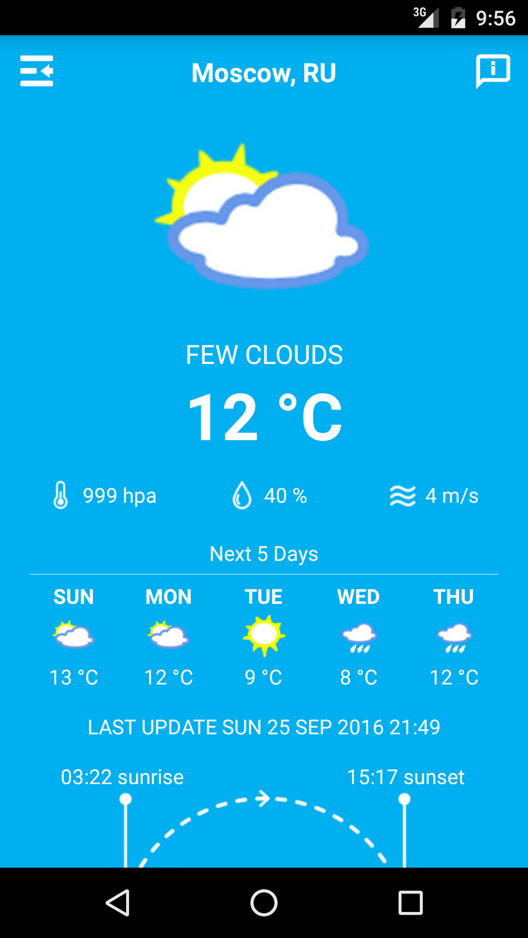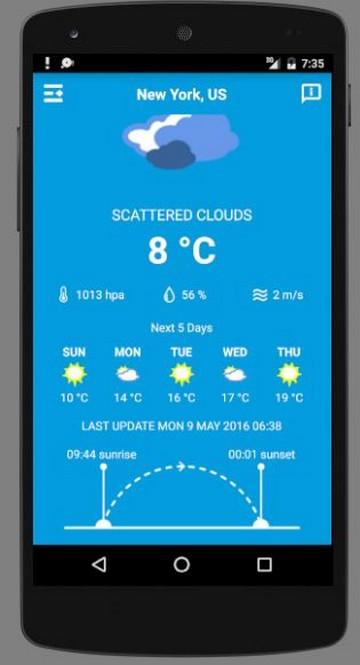 Moscow Weather 05 days, the weather in Moscow Cities with one click Moscow Weather 05 days is a free weather application that allows you to track the weather in Moscow and the area of your choice anywhere in the world (more than 1 Million City in the world) Weather Moscow is an intuitive and easy application, one click and you have the current climate of Moscow and weather forecasts Moscow within 5 days. Moscow Weather forecast is a very light android application which does not consume much of your smartphone resources. Meteo Moscow provides you with the following features: - Detailed Display bulletin City of Moscow - Add and delete a new city (top menu on the left of the screen). - Save a list of your favorite cities to track their climates later. - Current state of the Moscowc limate - Weather forecast for your city up to 5 days - Local time - Time of day - The humidity, pressure and wind - Time and exact time of sunrise and sunset - The current state of the climate, the temperature: high and low temperatures - Temperature display in Celsius or Fahrenheit (configuration). Weather Moscow 05 days needs a wireless internet connection, 3G or 4G to detect your location and provide you with accurate weather forecasts. For more improvements let us, please, comment.