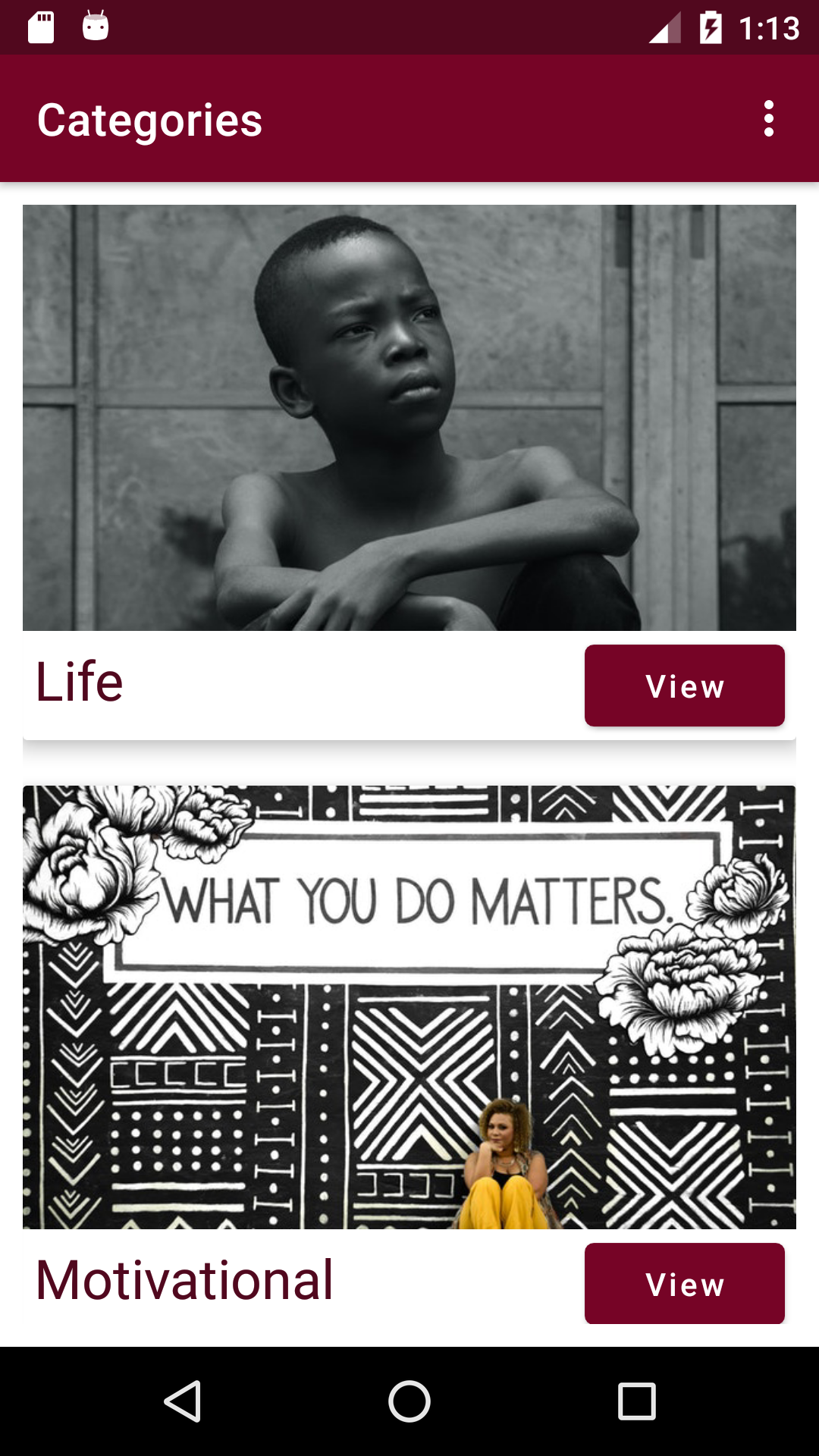 A collection of amazing motivational quotes that you can read every morning or share on social media platforms such as whatsapp, facebook, twitter. This motivational quotes application has a collection of different categories, which include: Achievement, Business Success, Challenges, Contentment, Despair, Determination, General Wisdom, Hardwork, Hope and Despair, Learning, Never Give Up, Optimism, Perseverance, Self Improvement, Spiritual Wisdom, Strength, Success, Wise Quotes, Wise Sayings, Wise Words, Words of Wisdom Each category has over 500 quotes making a total of approximately over 10, 000+ quotes. Download now and be inspired to follow that dream.