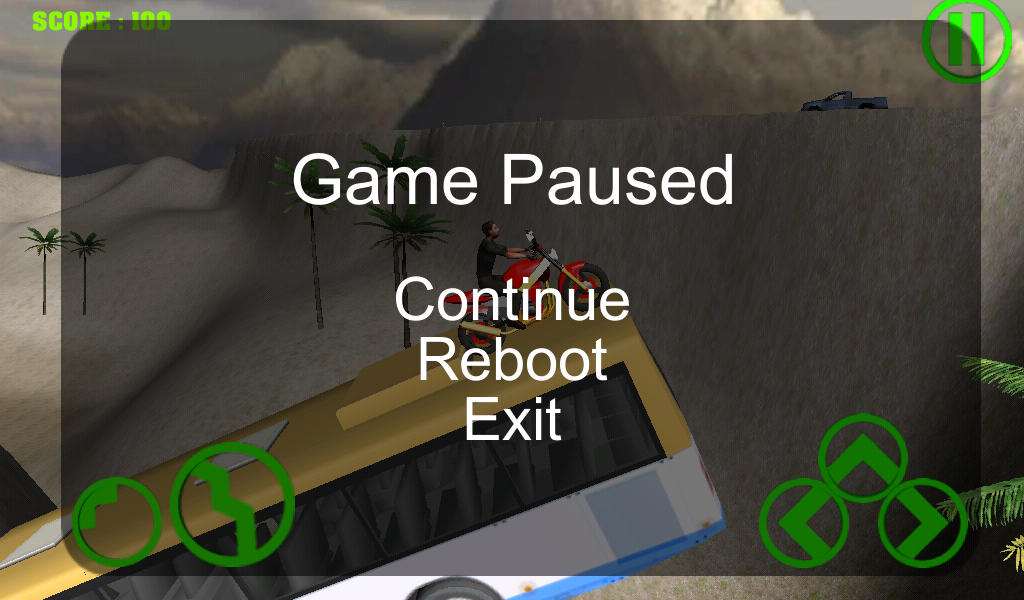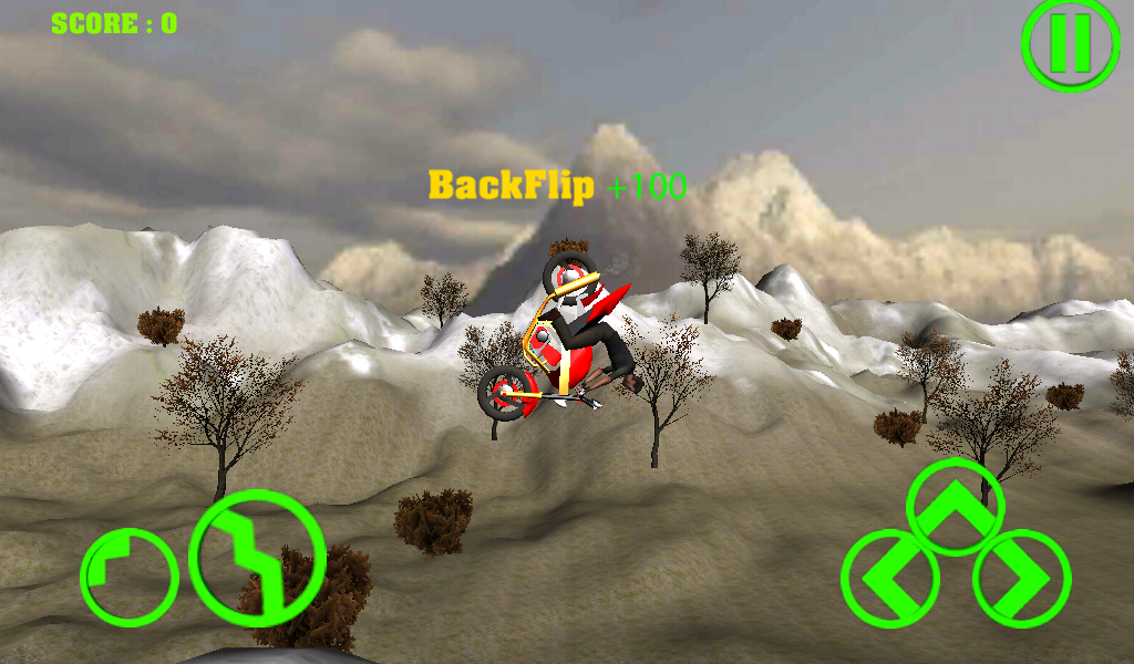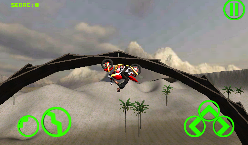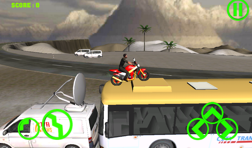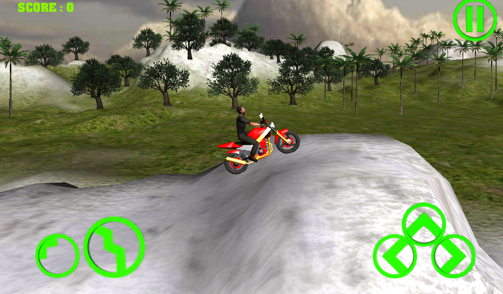 Accelerates and test your driving skills in this game full of mountainous terrain, loops, spins, hurdles, busy streets and many adventures. In this 3D motorcycle game go over an island full of obstacles and drive your motorbike through a number of difficulty levels formed by the different mountain areas you find your way. Instructions: - Use the arrow keys to jump and tilt your rider weight forward or backward. - Use the large button to accelerate and little to slow. - Press the jump button as you speed and get more power, ideal for flipping and passing loops. Whether you like motorbike games Cross or trial, or prefer the motorcycle racing, the sport bikes, motorcycle the GP or simply free motorcycle games, this game aims to get together all these features in a game where the action is assured. Runs an entire island through forests and mountainous terrain, crossing deserts and snow, jump on all types of vehicles like cars, vans, helicopters and other obstacles, make flips performing stunts in the air to add up points and see surpassing various fields and levels. In this 3D bike game can run, jump, crash and overcome all kinds of hindrances that are in your way. This includes all the bonuses that give you advantages in your driving or you unblock obstacles. Jump on various vehicles, dodging helicopters propellers and go with careful with fire. Dodge all the dangers that appear in your path and go surpassing difficulty levels. Walk forests, mountainous terrain, sandy deserts, snowy landscapes and reach the nearest town with your motorcycle through the different areas of an island full of adventures. In this 3D motorcycle game for mobile or tablet you'll find a game full of action that will hopefully be to your liking. We invite to you to download and already we comets that you thought.