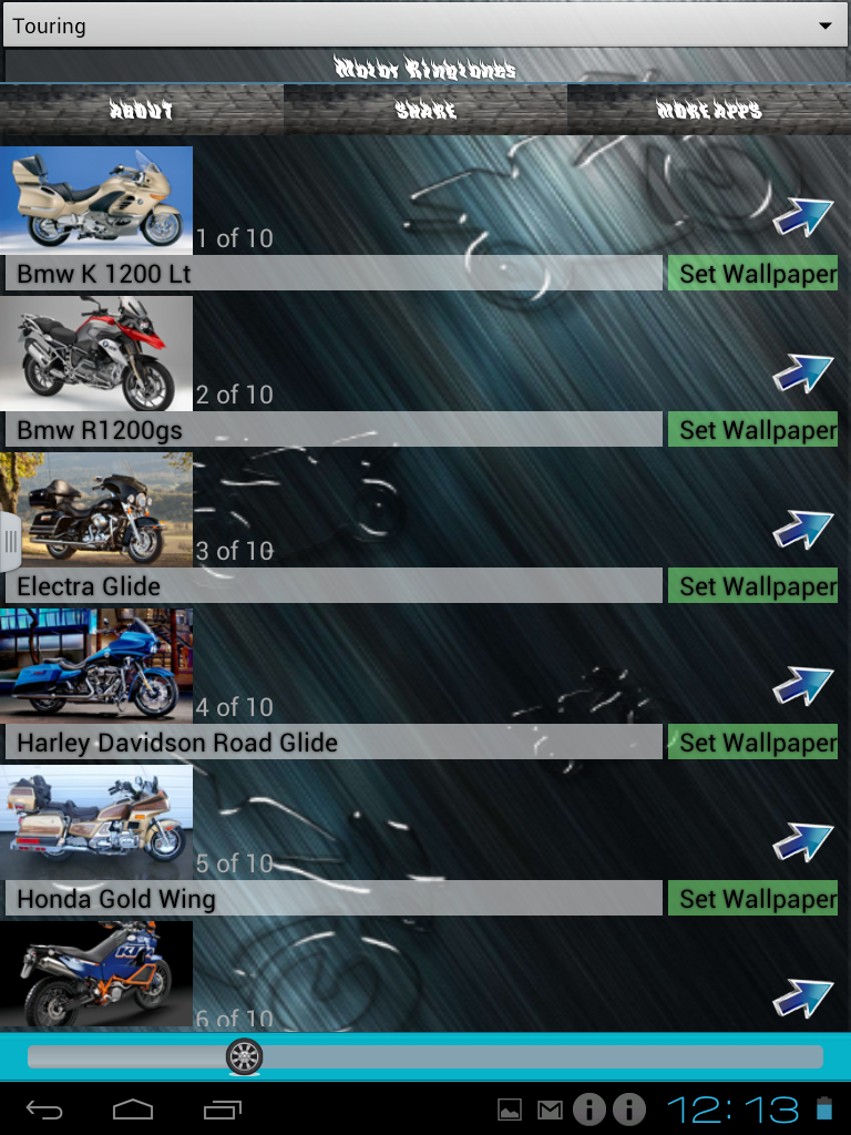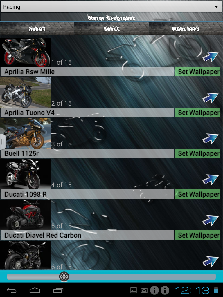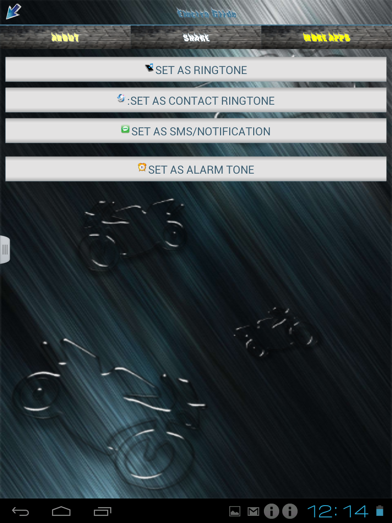 We present you our application Motor Tones and Wallpapers. Our team has carefuly chose the best exhaust sounds of the motorcycles and put them in the 4 main categories. Purpose of the application is that to give your android phone the characteristics of the motorcycle with sound as well as appearance with the selection of wallpapers for every sound. Features: - set sounds as SMS/notifications, contact ringtone or alarm - set as wallpapers - volume control button in application