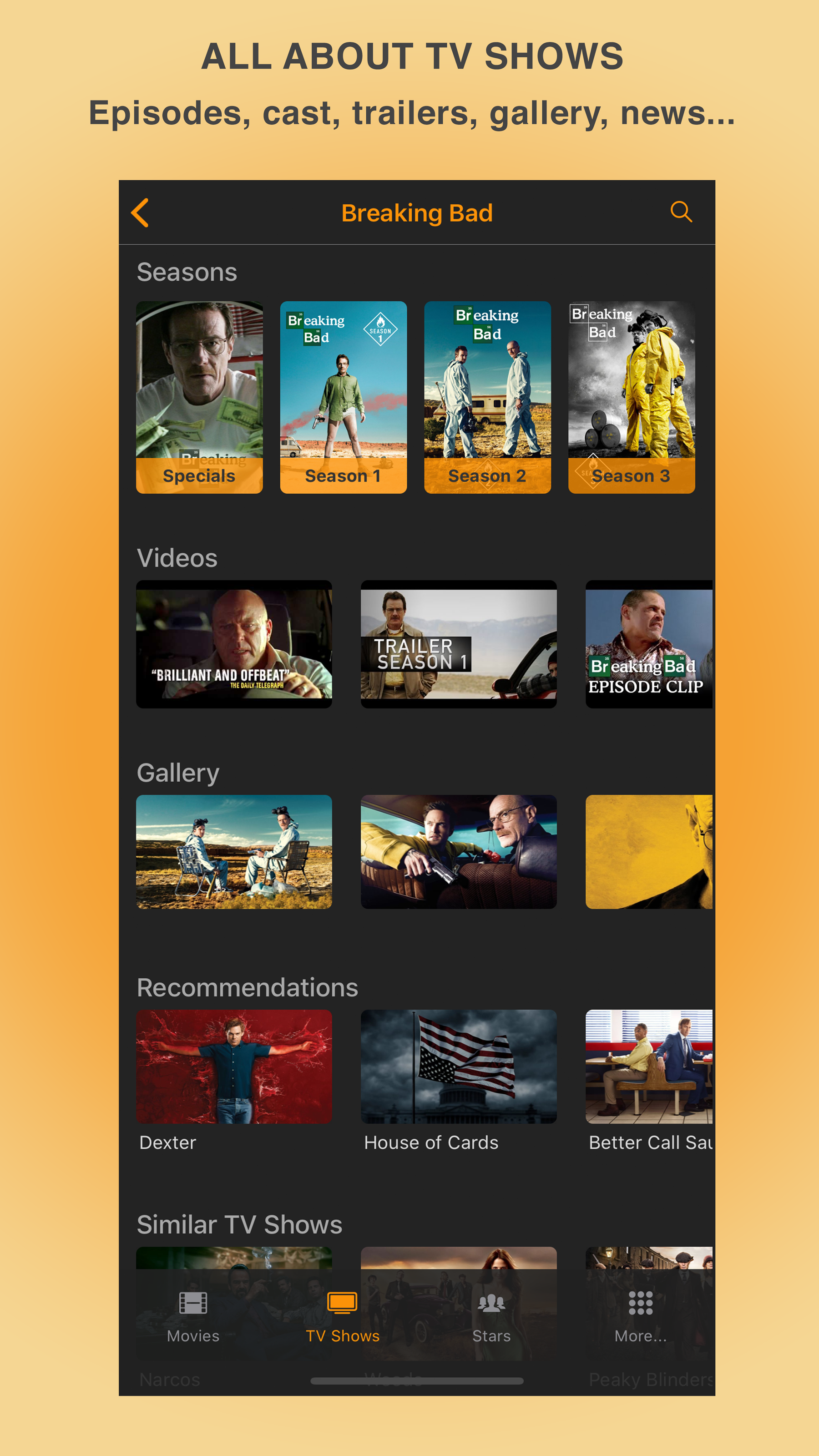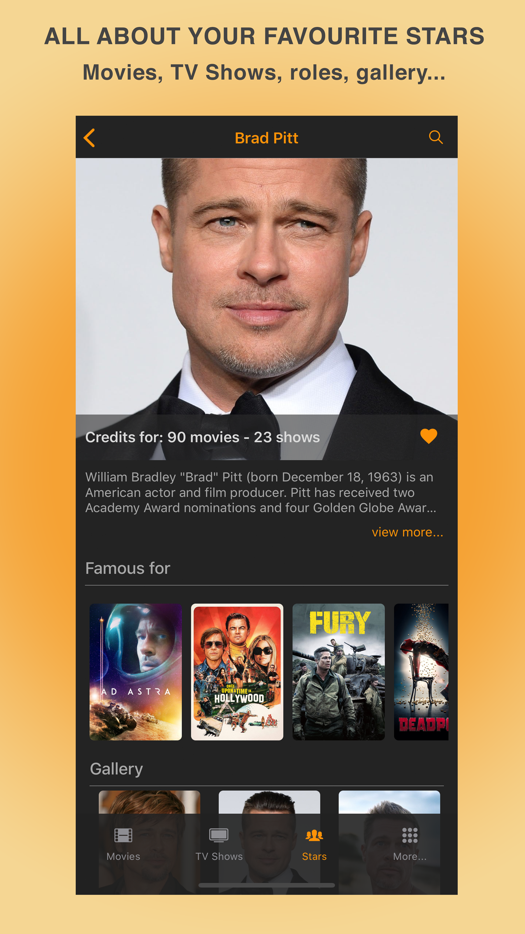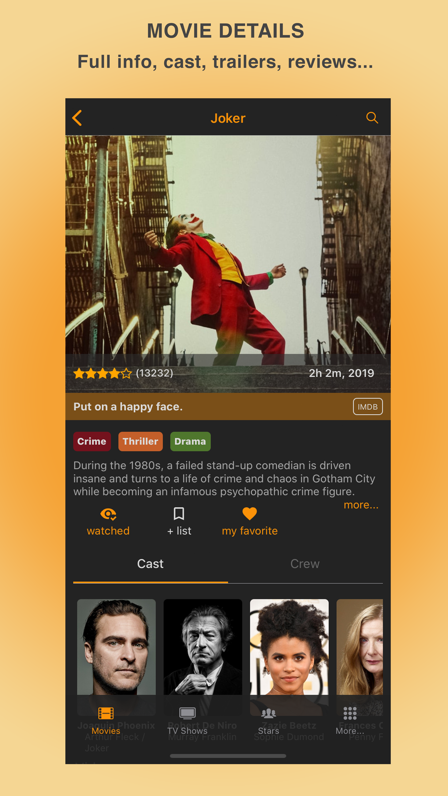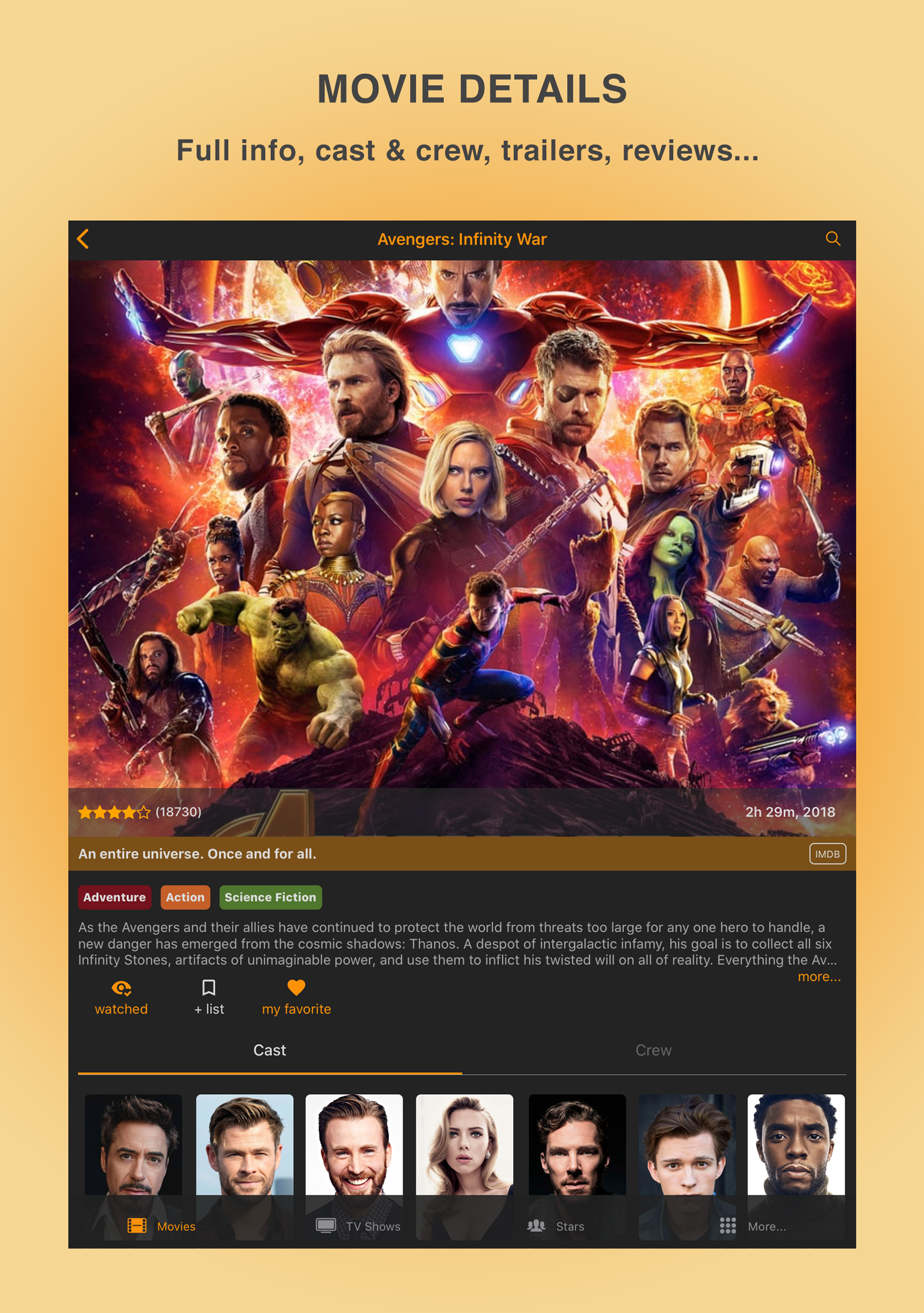 Explore a comprehensive Movies and TV Shows directory, providing access to thousands of titles, full cast lists, video trailers, image galleries, reviews, and news. Our app is completely free, ad-free, and requires no sign-in, ensuring a seamless user experience. Easily browse and search for your favorite content by title, genre, or movie stars. Manage your video content by marking items as Favourite, Watched, or adding them to your Watchlist. Utilize the Co-star Search feature to discover which movies two stars have worked together in. Please note that this app does not support movie streaming. This APP is totally free, no ads, no login. You cannot watch movies with this App!