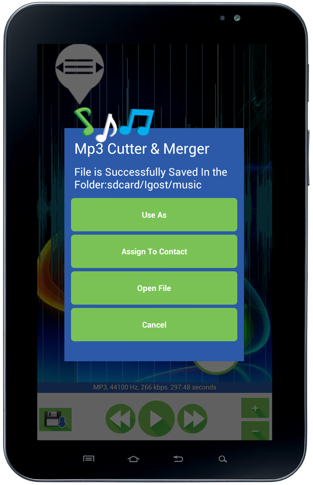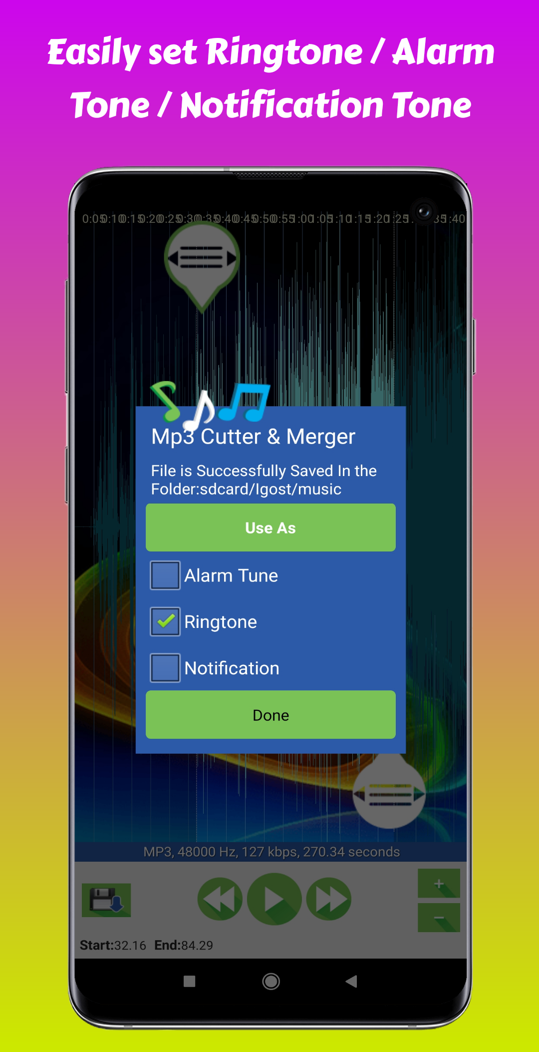 ✓After saving the trimmed mp3 u will get options for using the trimmed tone as alarm tone,ringtone,notification,assign to contact and option for opening the output folder.