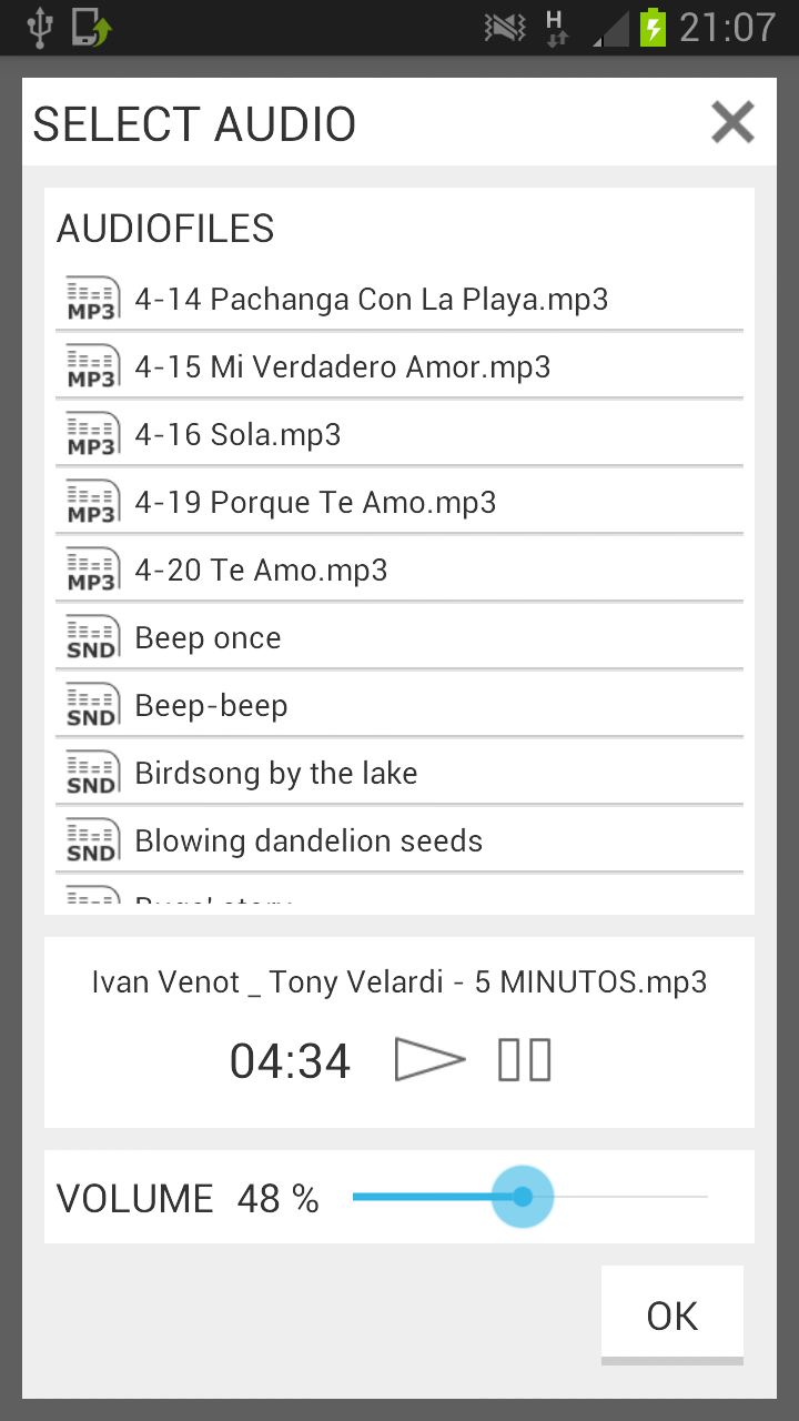 - Choose your alarm sound (mp3, ogg, midi) from the list in the pop-out.