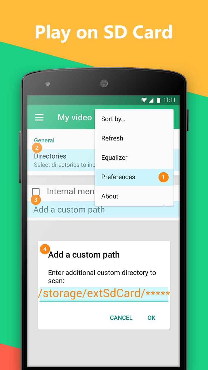 5. A dialog box appears with text input. If you have movies on SD Card in directory Movies, therefore you have to specify path like this: /storage/extSdCard/Movies