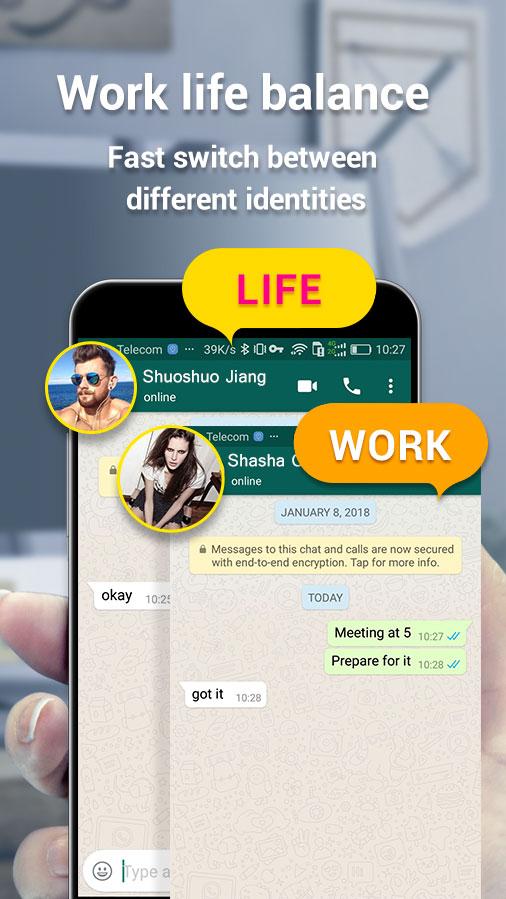 Super app clone & multiple account for parallel space One phone,two accounts,online at the same time Multiple space helps clone unlimited multiple parallel account for WhatsApp and Facebook or other social & game accounts and keep online simultaneously on one phone to separate work and life.You can get double whatsapp and double facebook easily. Feature: 😊 Parallel social accounts, including facebook, whats app, line, messenger etc. , help you to manage work and life 😊 Data of clones and original apps are separated,such as double whatsapp 😊 Privacy Locker to protect your cloned account 😊 Notification setting to manage notification of clones 😊 Two game accounts, help you upgrade level quickly 😊 Support most of android applications 😊 Privacy Locker to protect your private whatsapp clones 😊 Support to customize icon and label of clones Advantage: ❤️ Easy to use and simple UI ❤️ Switch fast between dual accounts with just one-tap ❤️ Enable Quick Switch to switch to clones in notification bar ❤️ Provider options to enable/disable Google Play Service, which can save memory & power for cloned app. Note: ☆ In order to make your application running well, we applied most of the android application. But we won't collect any user information. ☆ The memory of SuperClone used is the total size of the cloned application