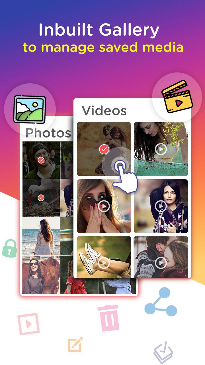 Inbuilt gallery to manage InstaSave photos and videos. You can also repost, share, lock, delete, multi select and slideshow using our inbuilt features. Sort saved photos and videos by username or date saved.