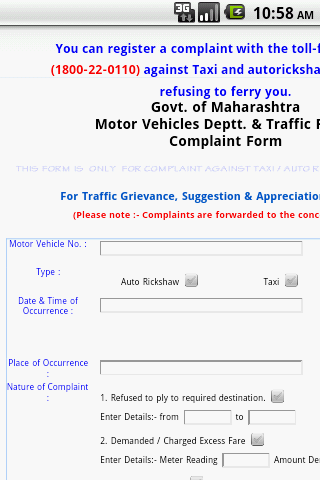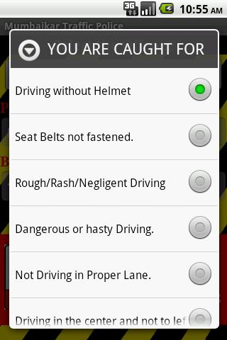 The project is about the traffic rules and regulations in India. Features of the project are as follows: 1 Report against taxi/auto driver to the traffic authorities. 2 Know about the offences and their respective penalties with the sections booked under. 3 Get free SMS alerts on traffic. 4 Send mail to traffic authorities for complains/feedback. 5 Get the address of the police chowkies (traffic stations)where your vehicle has been taken after towing. 6 Emergency call numbers. 7 Taxi/auto fare card. 8 Various traffic signs guidance.