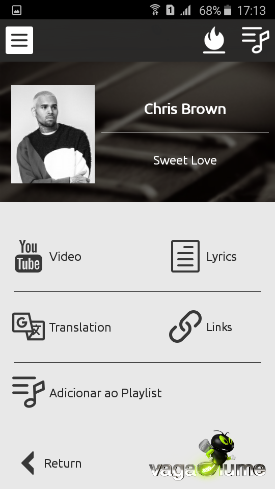The Vagalume logo is displayed in the application according to the terms of use of it.
