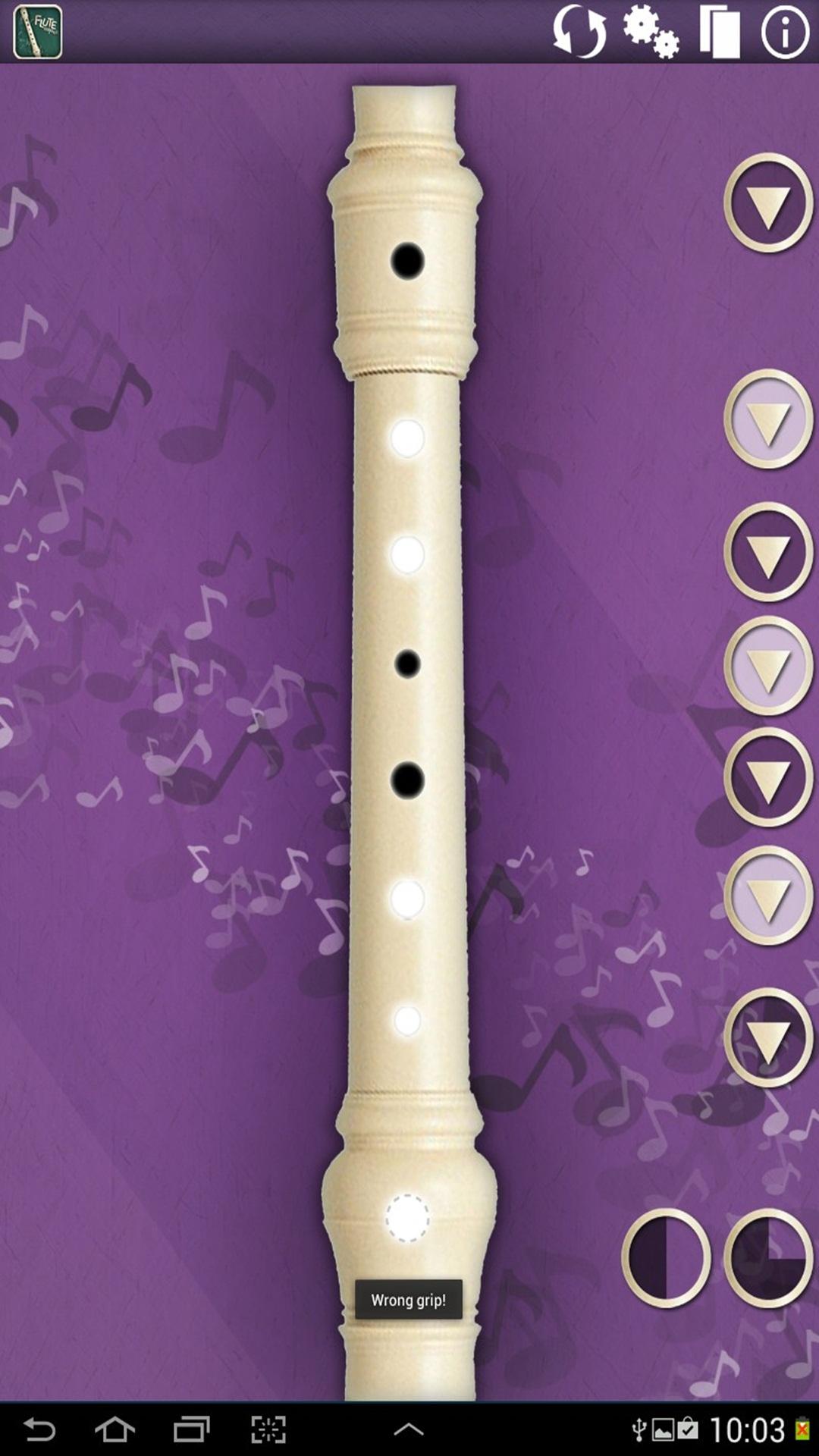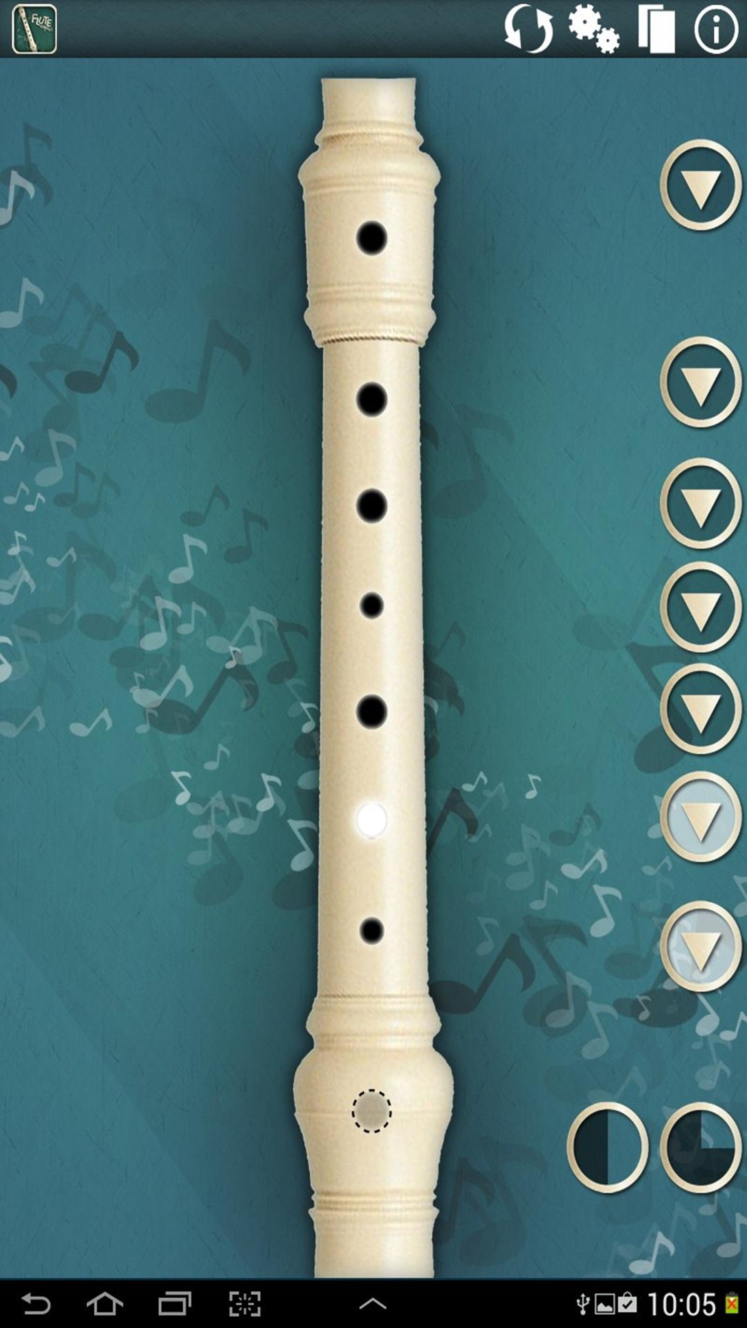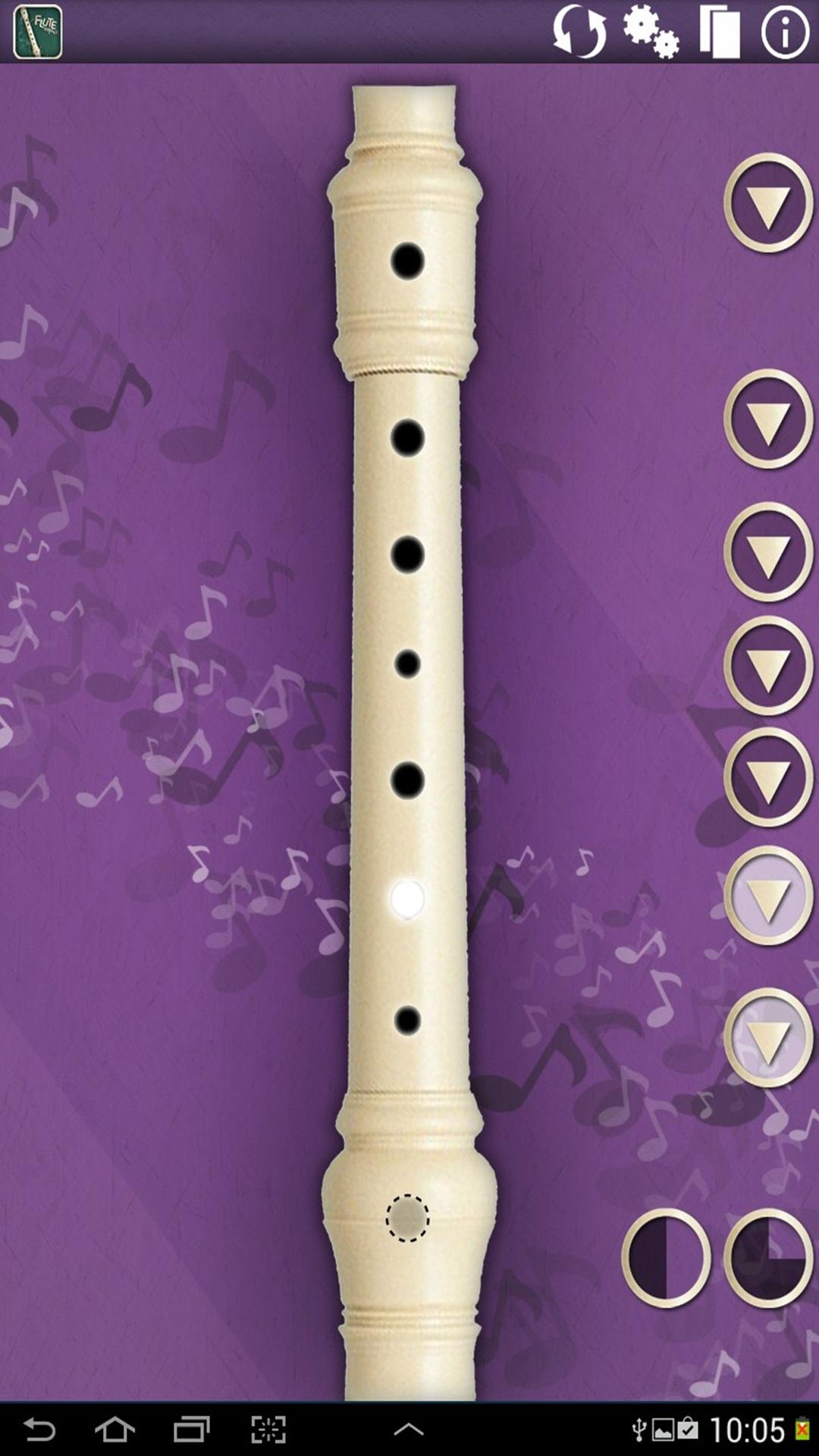 ♪ The buttons correspond to holes the flute. You can decide whether to put them on one side or on both sides of the instrument. The first three buttons on the left side correspond to holes covered by fingers of right hand. When you press one button, you cover all holes from the bottom of the screen to place of the button. When you press two buttons at once, one of them cover these holes, and another opens previous ones. This way you will be able to play any note you choose