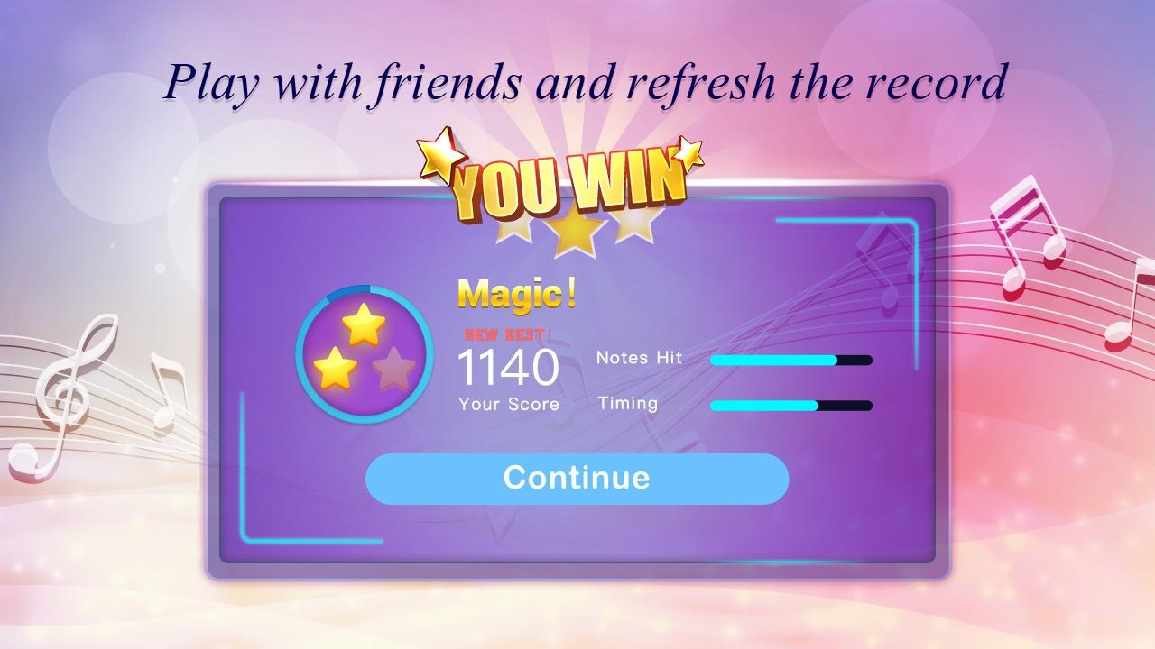 Piano is not only a magic music game but also the latest popular piano game. Music piano is a piano game with a magic keyboard. It is like a magic music treasure box. It has a luxury music feast, precise rhythm feel, difficulty advanced mode and an exquisite game interface! Music piano is not the same as other existing piano games. In this game, players can play like professional pianists. With the wonderful music in background, players need to master the rhythm of each note, click on the falling piano round tiles, not miss each any, and then finish each song coherently!