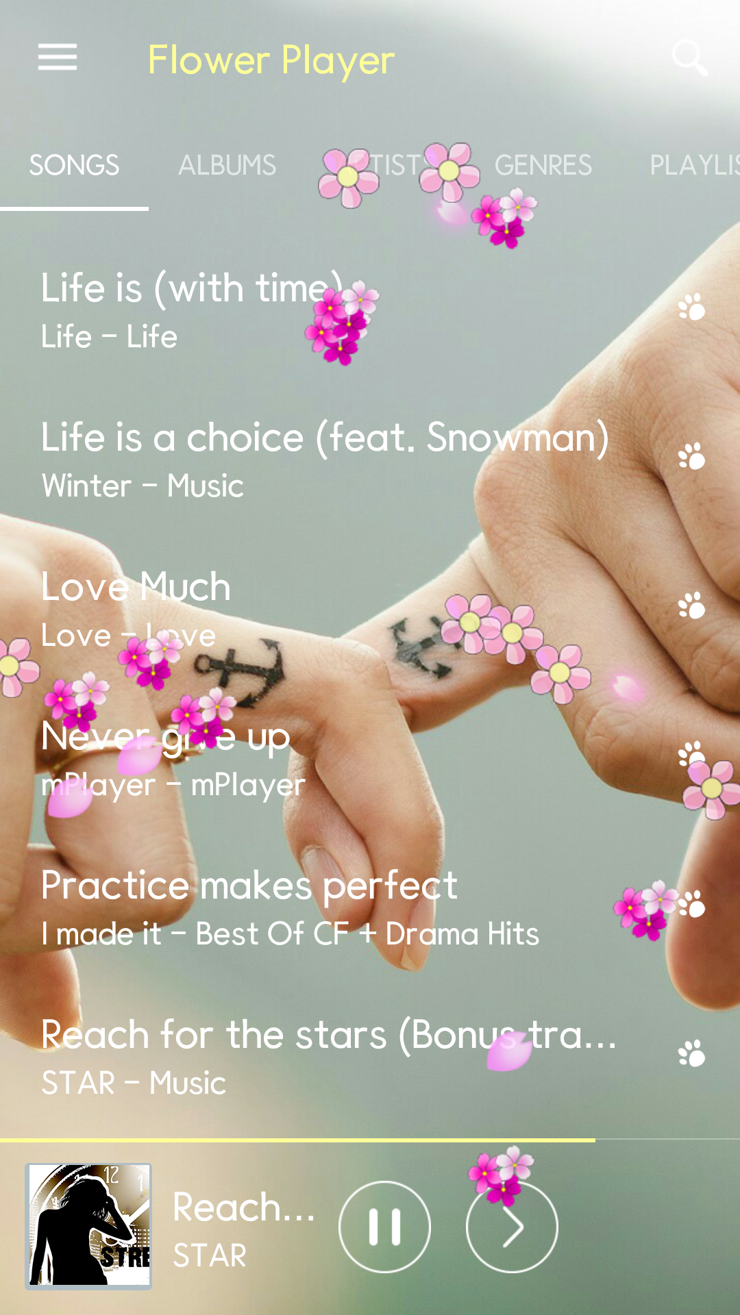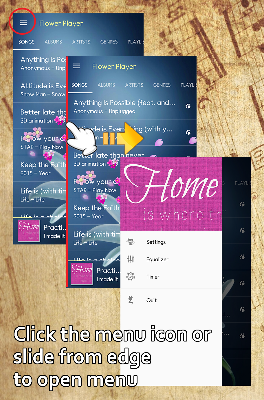 Click the main screen, hold and drag to the right or to the left turns the page. All songs, favorite artists, are displayed as a list of songs by genre. Please start by touching the song in the playlist.