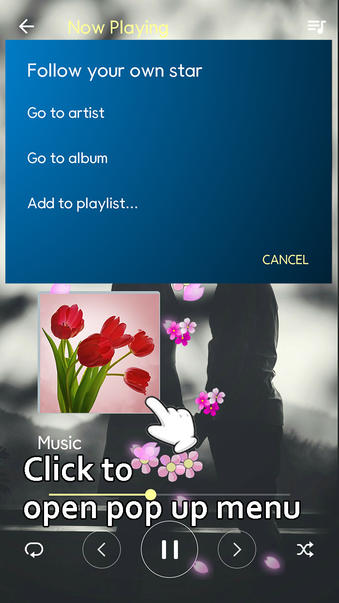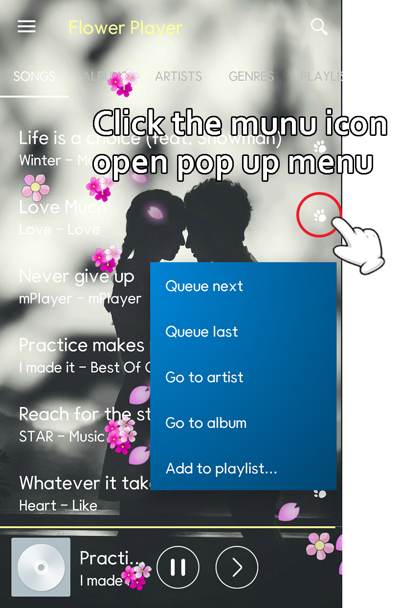 When you click the icon, or click the footprints cute artist Play screen appears on the cover image, a pop-up menu. Add to Favourites find a list of selected from the pop-up menu, or you can view the artist information and album information.