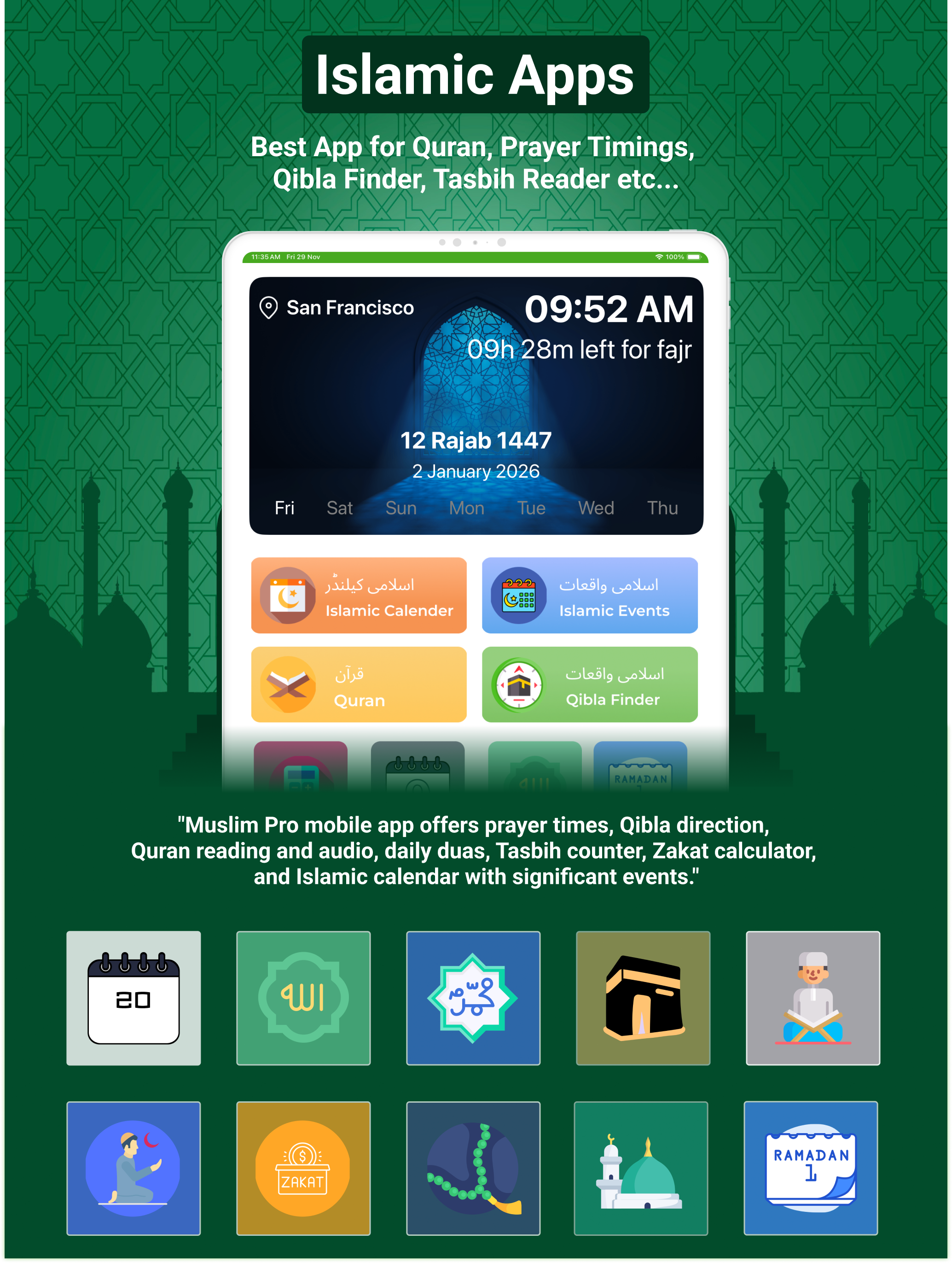 2026 Islamic Calendar App: 2026 Muslim Prayer Times, Quran and Qibla. Stay connected to your faith with this all-in-one Islamic app. This Muslim guide provides Quran recitation, Qibla direction, nearby mosques, Islamic calendar 2026 in urdu, Ramadan timings, Zakat calculator, 99 Names of Allah & Prophet (SAW), daily duas, Tasbih counter, Hajj & Umrah guide, 6 Kalimas, Surah Yaseen, Hijri converter, Islamic names, and more. Perfect for every Muslim who speaks urdu.