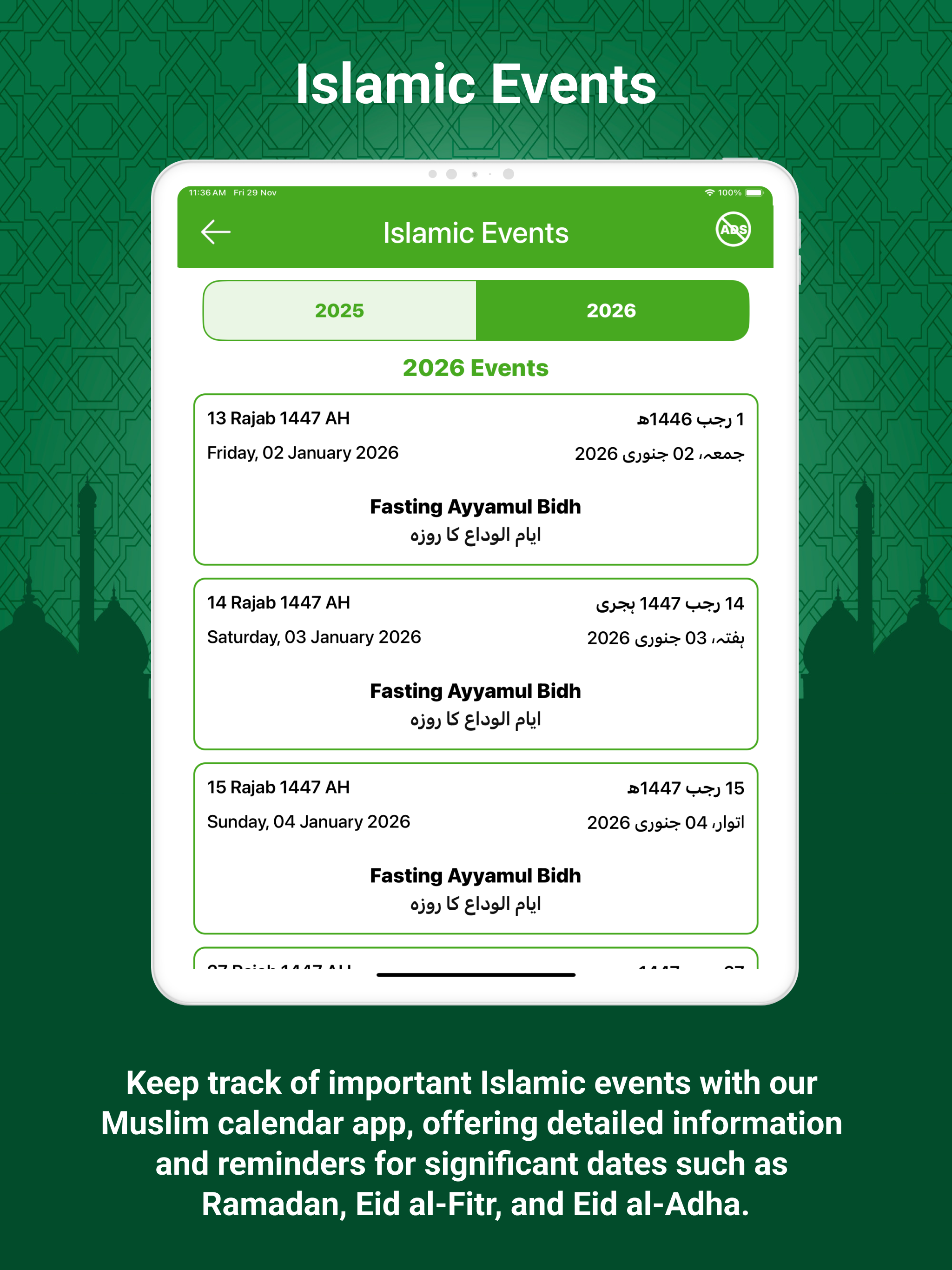 - Islamic 2026 Events: Get timely reminders for Islamic events such as Lailat-ul-Qadr, Ashura, Hajj, and more. Plan your religious observances with precision.