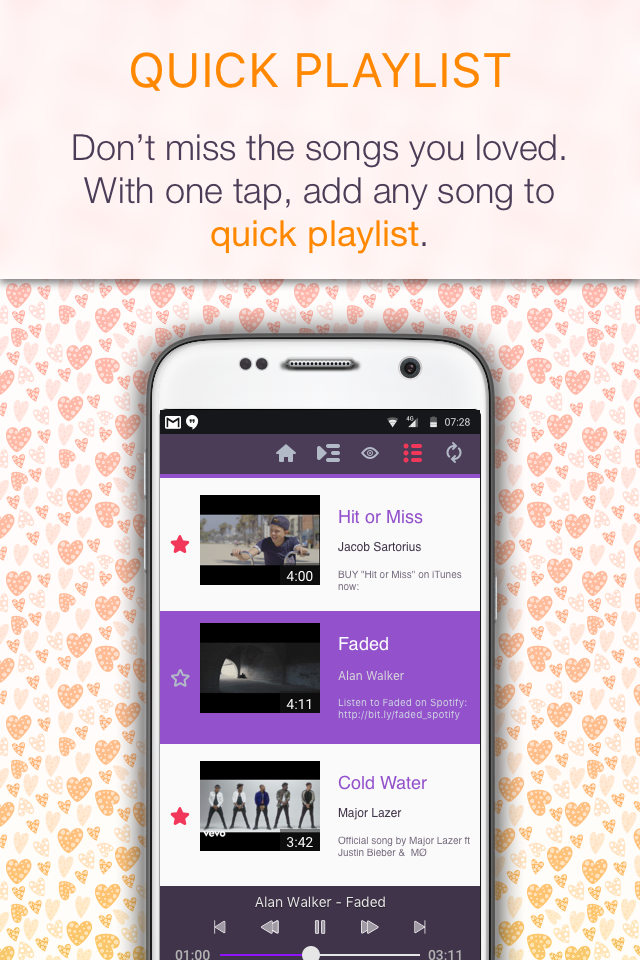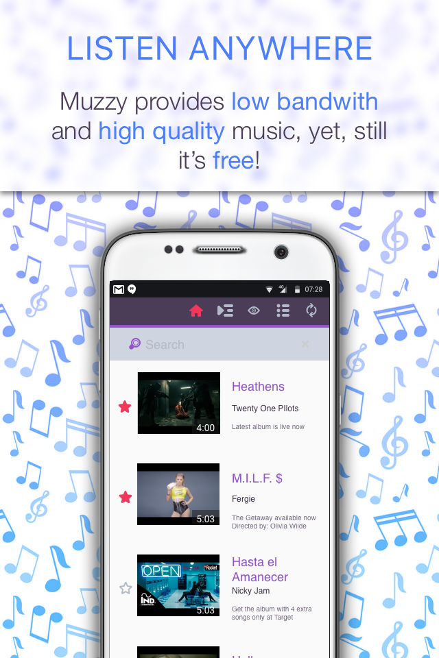 Muzzy provides free music streaming based on Soundcloud that has always been supported with millions of latest, popular songs and newest audio by music lovers from all over the world. Reach any track you look for just in seconds. Search, tap and listen. Are you old, 80s, instrumental or piano enthusiast? Then get the advantage of music libraries that Muzzy gives you such as radio, 70s, children, english, christian, piano, christmas and violin. Here look at the features of Muzzy: 1. Instant Search – Autocomplete composers, genres or albums – Results for the best singers, popular artists 2. Shuffle and Repeat Mode – Shuffle playlist or related musics – Listen on repeat – One song or playlist repeat 3. Auto Suggested Hits & Related Audio – Tap a track and listen related musics. 4. Free Music Box – Unlimited search and endless play. – Free forever 5. Quick Control Widget – Control via remote media buttons 6. Quick Audio – Just download from playstore and listen online instantly. – Music paradise and rich mp3 collection 7. Player Control – Forward, rewind, start and stop track 8. Top 100 Songs – Updated trending charts – Discover the best 100 newest songs 9. Listen In Background – Play mp3 even minimized. – Listen mp3 even on locked screen. 10. Manage Playlist – Create playlist and add track 11. High Quality Sound and Mp3 Streaming Muzzy supports wide range of genres like classical, metal, techno, house, pop, country, live, rock, deep, electro, club, dance, blues, reggae, trance, r&b, gospel, jazz, rap. If you have issue related to copyright, please contact with Soundcloud. Because we totally obey the API Terms of SoundCloud and do not let to download or cache any track. For detail visit here: http://soundcloud.com/api