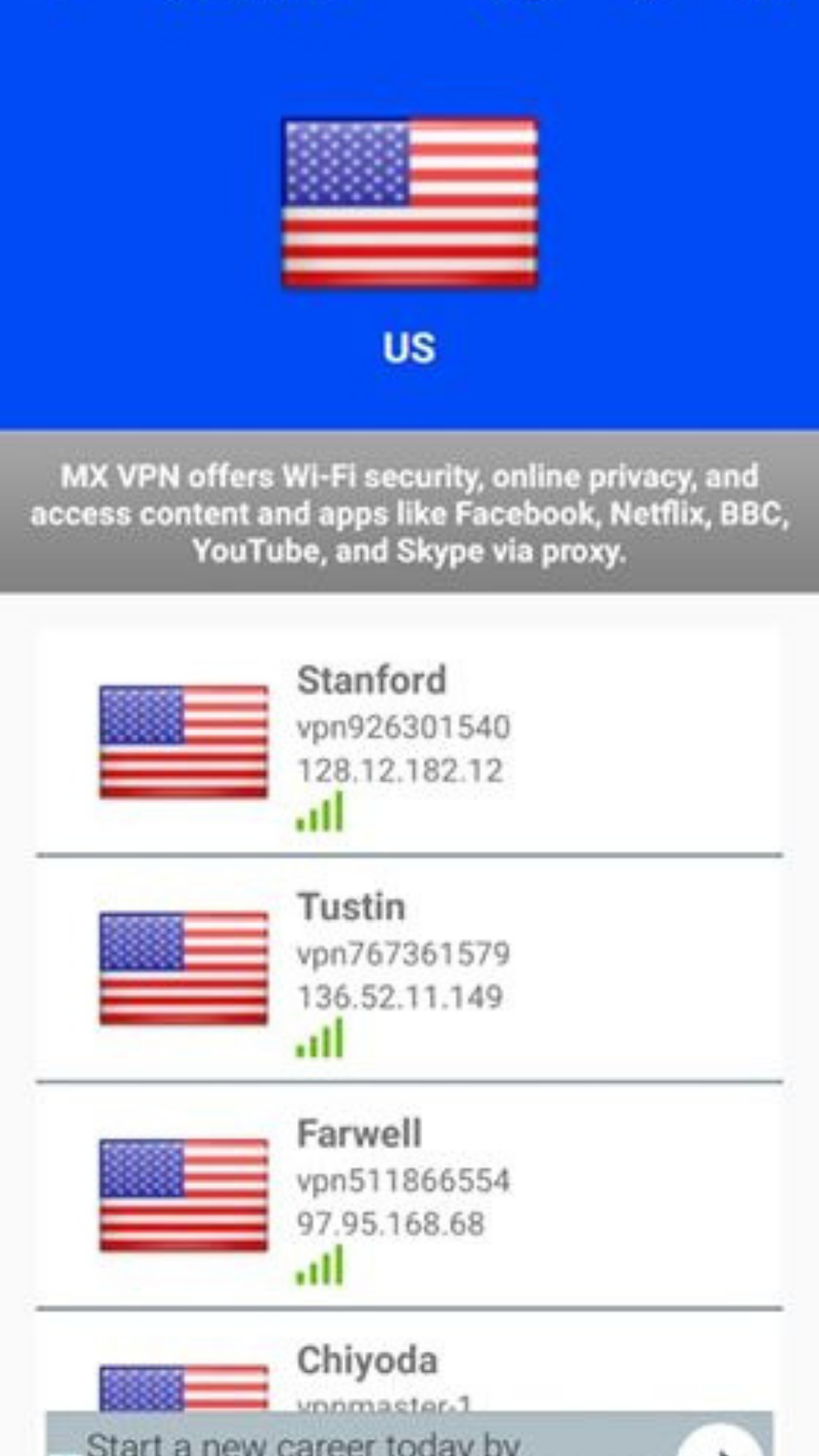 MX VPN (Package Name: com.mx.mxvpn) is developed by Feroz and the latest version of MX VPN - A high speed, ultra secure VPN 1.1 was updated on March 7, 2019. MX VPN - A high speed, ultra secure VPN is in the category of Tools. You can check all apps from the developer of MX VPN - A high speed, ultra secure VPN. Currently this app is for free. This app can be downloaded on Android 4.1+ on APKFab or Google Play. All APK/XAPK files on APKFab.com are original and 100% safe with fast download.