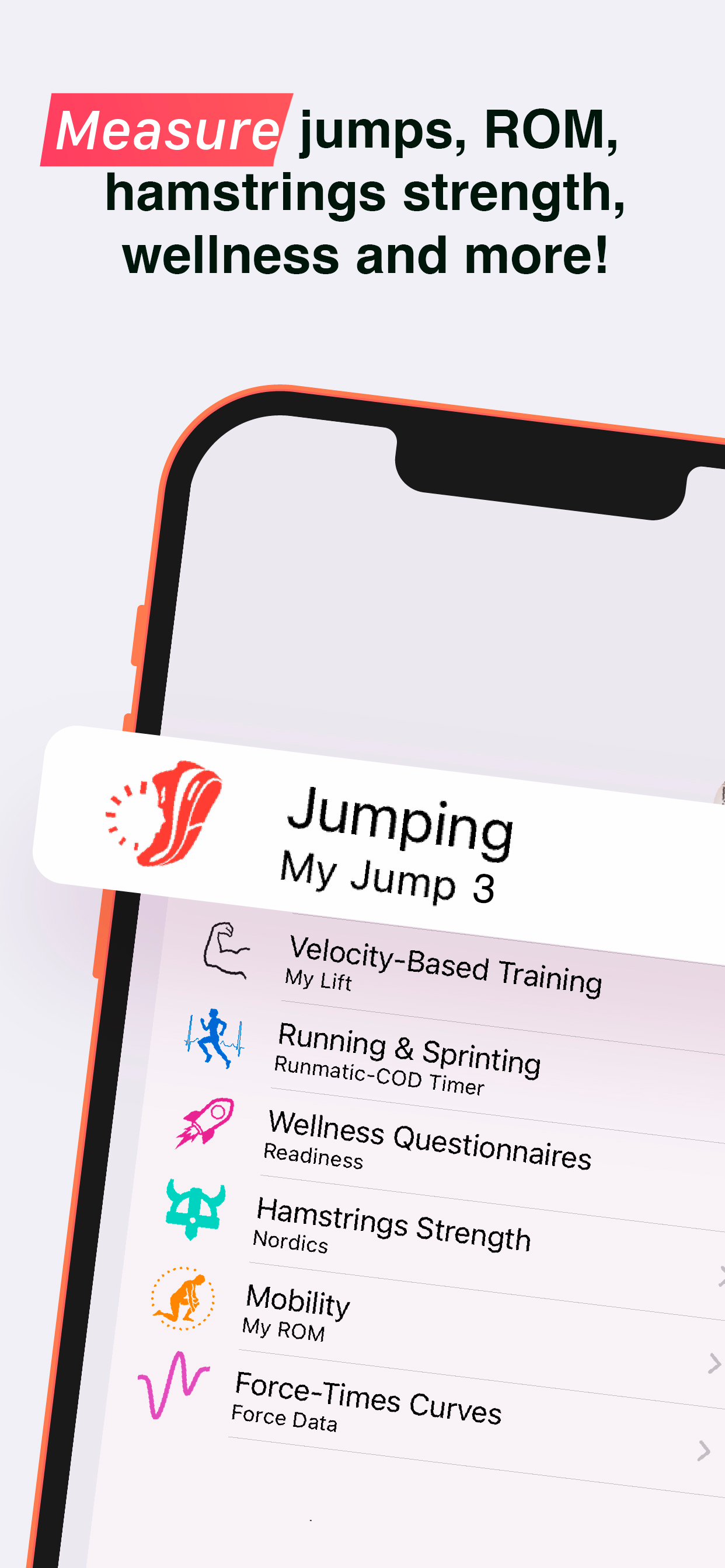With My Jump Lab you can assess more than 30 performance tests, covering jumping, strength, sprinting, change of direction, mobility, wellness and force-time analysis — all within a single, integrated platform.