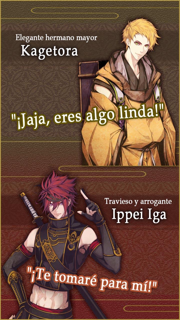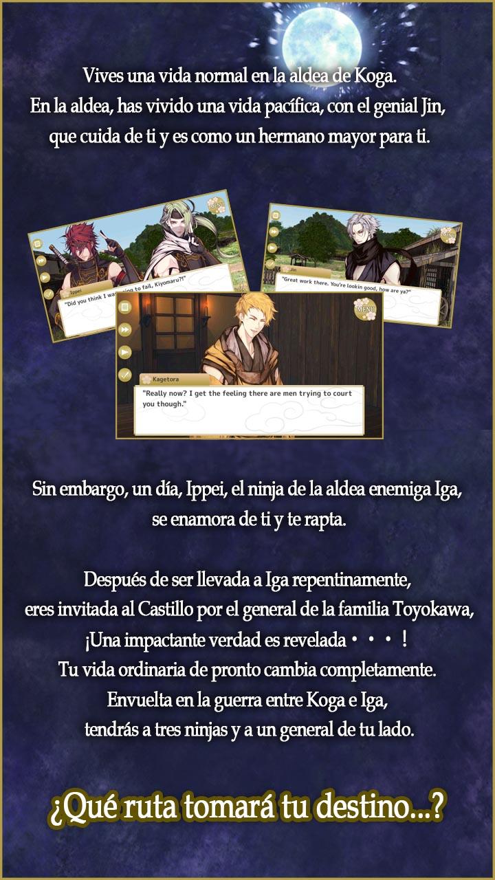 ◇◇¡¡Disfruta este juego gratis!!◇◇ ◇◇"My Ninja Romance" es una aplicación de romance con ninjas, que cuenta la historia de amoríos y vínculos que crearás con apuestos y jóvenes ninjas ◇◇ ◇◇¡Tú eres la heroína! Tomarás el papel de la heroína y experimentarás amoríos con los ninjas que juraron protegerte. ◇◇ ■■Sinopsis■■ Vives una vida normal en la aldea de Koga. En la aldea, has vivido una vida pacífica, con el genial Jin, que cuida de ti y es como un hermano mayor para ti. Sin embargo, un día, Ippei, el ninja de la aldea enemiga Iga, se enamora de ti y te rapta. Después de ser llevada a Iga repentinamente, eres invitada al Castillo por el general de la familia Toyokawa, ¡Una impactante verdad es revelada・・・! Tu vida ordinaria de pronto cambia completamente. Envuelta en la guerra entre Koga e Iga, tendrás a tres ninjas y a un general de tu lado. ¿Qué ruta tomará tu destino・・・? ■■Acompañantes (Personajes)■■ ◆【Travieso y arrogante】 Ippei Iga Estatura: 175 cm Edad: 25 años ¡Te tomaré para mí! Un ninja de la aldea de Iga. Después de conocerte repentinamente, se enamora y te rapta. Él piensa que Jin, el líder de la aldea de Koga, es quien mató a su abuelo. Aunque es arrogante, también tiene un lado de hermano mayor. También tiene un noble y abnegado corazón, y te protegerá a toda costa. ◆ 【Fuerte hermano mayor】Kiyomaru Iga Estatura: 190 cm Edad: 25 años Protegeré tu vida, incluso si significa sacrificar la mía. Él siente que Jin de Koga es su rival. Su largo cabello lo recoge con una coleta de caballo, y tiene una leve silueta femenina. Él actúa como el joven líder de la aldea de Iga, en quien todos confían. Es positivo, avanza y constantemente piensa en las personas de su aldea. ◆ 【Tranquilo y gentil】Hideyasu Toyokawa Estatura: 172 cm Edad: 25 años Tenerte aquí, me cambió. Es el séptimo General Shogun y joven príncipe de la Familia Toyokawa. Él tiene una prometida llamada Kikuhime. Es un Shogun generoso, que es amable con todos. Debido a esa personalidad, el consejo de ancianos está preocupado por su futuro como Shogun. Sin embargo, de hecho, es un razonador profundo que tiene la habilidad de tranquilizar cualquier situación. ◆ 【Elegante hermano mayor】 Kagetora Estatura: 183 cm Edad: 30 años ¡Jaja, eres algo linda! Es un vendedor de medicina que a menudo visita la aldea de Koga. Lo conoces desde hace mucho tiempo, sin embargo… Sus orígenes son un misterio y hay muchos lados suyos que no conoces. Su apariencia puede parecer un poco conquistadora, sin embargo, es servicial y confiable. Él tiene un interés en ti y comienza a inmiscuirse. ◇◇¡¡Disfruta este juego completamente gratis!!◇◇