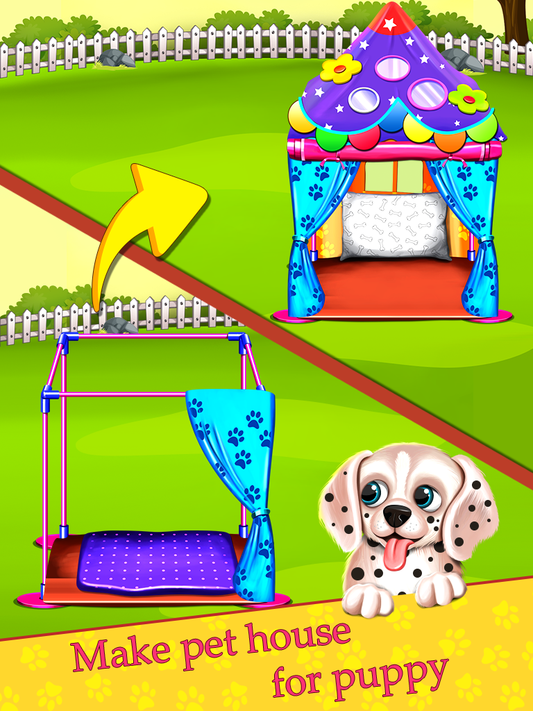 Enjoy this all-in-one puppy day care - the cutest game ever! Let's show some virtual pet puppy love. Here, we can do some amazing activities in sweet dog daycare to enjoy the best pet care games for you. we have included all the tasks those you wish to have in a perfect puppy daycare game. we are sure that you will enjoy performing each and every tasks whether it would be rescuing or grooming or preparing pet's house etc.... Be the part of this amazing animal game to discover your inner skills when it comes to handle an injured puppy! The puppy, here,requires a serious attention of yours. If you want to make him happy, you are going to offer him a special treatment once with the nursing. Be the great Vet for your little pet and perform the medical tasks accurately. Please, don’t miss any of them because each one has an important role for this poor pet that will cure it and make it happy. Oh no! puppy' s head is stuck with bucket. Rescue it smartly. Cute little puppy is injured. Take care of it.Heal wounds,do nail care,ear cleaning and tail triming by using various tools like bandage,cotton,antiseptic cream,nail cutter,razor,etc..... Build and construct a new beautiful home for your pet. Enjoy puppy house cleaning and house decoration.Don't forget to serve food and water near house. puppy daycare is all about dress up your pet. Accessorize your little puppy with beautiful dresses , necklaces , goggles and caps and do it's makeover. You will get different options for puppy's food utensil and toys also. Puppy' s teeth are hurting. Let’s help him in cleaning teeth and kill the germs bacteria. Same as human teeth treatment, remove all the cavities from the puppy's mouth and perform teeth replacement procedure. Little pet is injured while playing . It needs immediate surgery. Get ready with your surgery room! Learn about all the medical tools used in first aid treatment. Make sure the little puppy feels less pain. Start with essential check ups like bp and heartbeat and then perform other surgical tasks. Remove wood stuck on body, dressing of wounds, apply ice on swelling head and so on. puppy' s tail bone is injured. Perform bone replacement surgery and plaster the tail for fast recovery. prepare some delicious food and feed for newborn pet. You will get a chance to cook variety of foods like sandwitch,soups and egg custard for a puppy animal. Make sure he eats well and gets enough energy for playing. Grooming is very important for good health. Give your furry puppy friend a warm bath and a nice hair treatment to make it look adorable. Don' t forget to apply a cute tattoo on it' s body to make puppy look more cool and dashing. Like us, our pets also prefer their rooms tidy and clean.A beautiful room with comfortable bedding will help them get better sleeping experience.Clean and wipe its messy room,re- rack items on its proper place and then prepare a cosy bed for this little pet. Start slow music and turn off lights, then wish it a good night sleep. Oh! my my! puppy is dreaming while sleeping! what is he seeing in it' s dreams?! I won' t tell that. you have to find out secret about dream by playing game yourself. Even our pets need a beautiful garden to play there.It' s our duty to do make over of garden area and make it suitable for puppy. First of all, you need to clean the garden thoroughly. Repair fountain by playing a mini game and keep beautiful decorative plants. Repair fence for safety of dog. At last, light decoration will enhense the beauty of garden. You will get fun while learn experience by performing every activity.This is very engaging game for sure! Go for it and enjoy this beautiful journey!