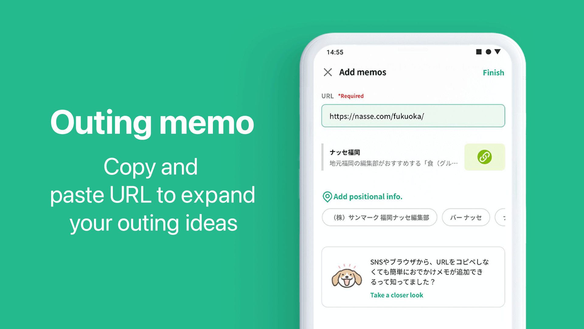 I want to go! Sounds fun! Looks delicious! from URL/photo/text to create and save an "Outing Memo" and look back on it at anytime.