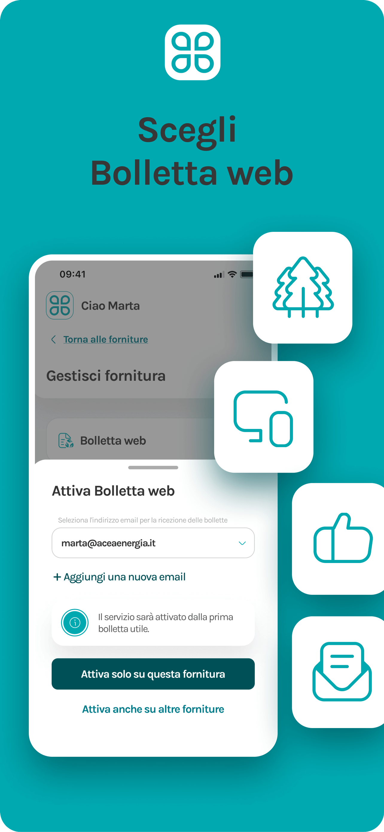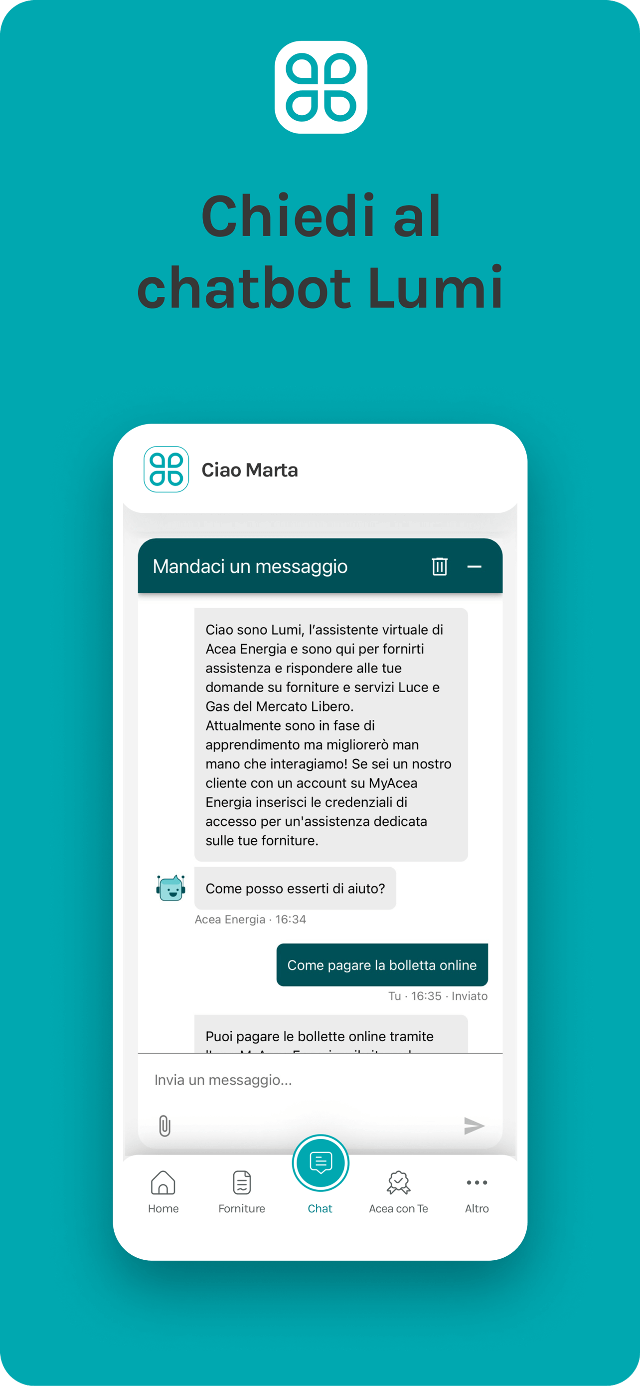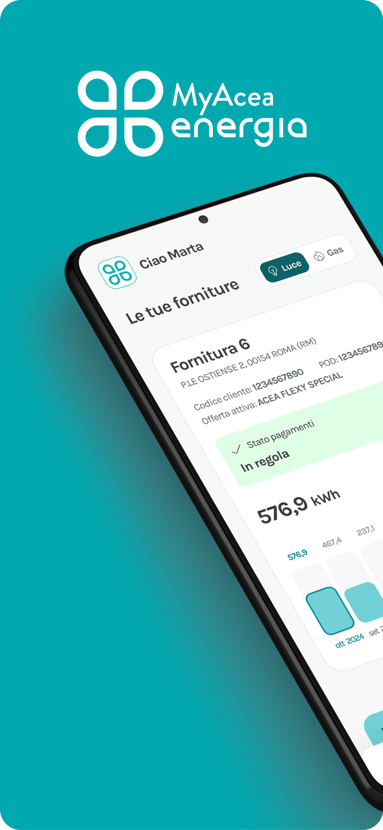Download the MyAcea Energia App for free, dedicated to customers with a tax code. Manage your electricity and gas supplies in a simple and fast way: check your bills, communicate self-reading, activate various services such as web bill, direct debit, start a request, pay any estimate or invoice and follow its progress and discover the news of the Acea con Te loyalty program. HOW TO ACCESS: • If you are a customer registered in the MyAcea Energia reserved area, use the same email and password to access the application. • If you are not yet registered in the MyAcea Energia reserved area, you can do so directly from the MyAcea Energia App or from the website https://my.acea.it/energia/registrazione We remind you that to use all the features available on the App, you must first associate the electricity and/or gas supplies to your profile. MAIN FEATURES OF THE APP: • Web bill: to receive your bill directly in your email inbox for free, on the day it is issued, eliminating the paper copy and making an ecological choice • Direct debit service: to activate or modify the debit of your bills directly to your current account for free • Consumption and readings: to view the trend of your consumption and consult the history of your meter readings • Invoices and payments: to always have your bills under control, know their status and be able to pay those due by credit card • Request new operations and monitor progress: for example, you can change the power or voltage, proceed with the payment of the estimate or the related invoice and follow the progress until the end of the activity. • Lumi Chatbot: for any doubts or needs you can ask Lumi, our digital assistant available 24/7, to get immediate answers to frequently asked questions about your electricity and gas supplies, bills and Acea Energia services. Download the MyAcea Energia App now and simplify the management of your supplies!