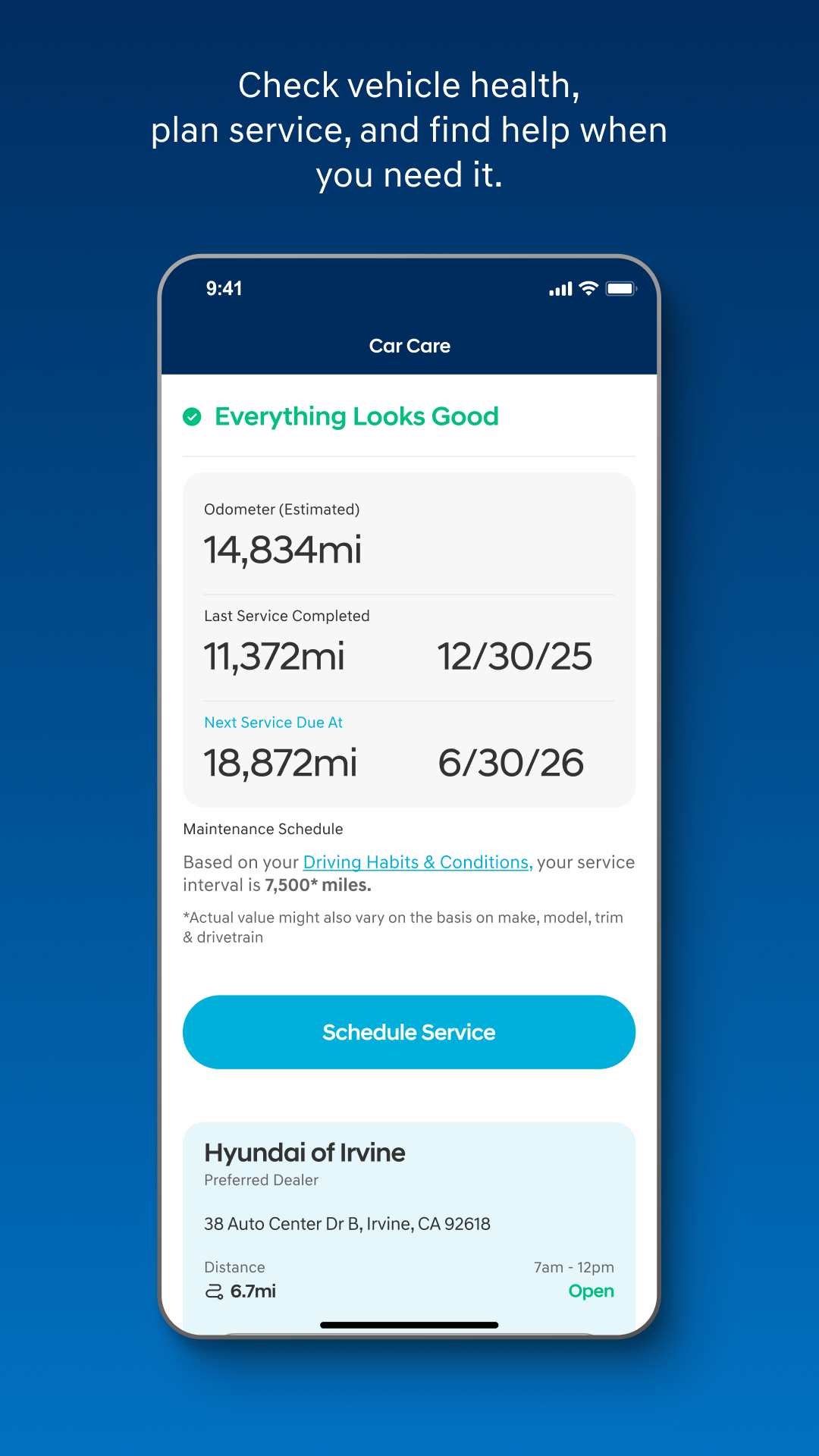 The MyHyundai app makes getting information about your Hyundai vehicle easier than ever. The MyHyundai app allows you to access owner resources, schedule service or connect to your Bluelink enabled vehicle from your phone. Bluelink technology enables and empowers you while you are on the go, giving you access to your Bluelink features from your office, at home, or just about anywhere.