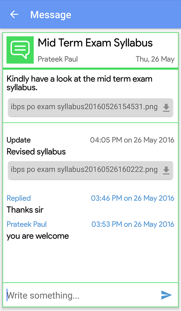 myly admin app, specially designed for educators, makes it very easy for them to reach out to entire class/individual at a single click, share images, take attendance and create engagement.