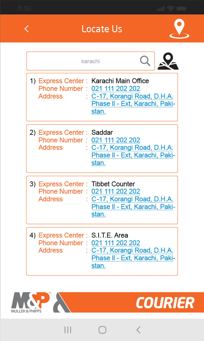 Muller and Phipps presence in Pakistan dates back to the year 1912 and has been operating in Pakistan for 107 years now. M&P is a part of The Getz Group, which is an international marketing, manufacturing, and distribution company having a presence across 80 locations in 36 countries throughout the Asia Pacific region. Muller and Phipps is the largest “Distribution” network of the country. In order to further acquire the last-mile delivery capability, Muller & Phipps Pakistan acquired one of the leading Courier and Logistics companies of Pakistan in the year 2015 and renamed it as M&P Express Logistics Pvt Ltd. With this acquisition, Muller & Phipps in Pakistan has become a major operator in Distribution, Courier, COD, and Logistics services of the country. M&P Courier now introduces its mobile app, "MyM&P". With MyM&P, M&P Courier enables you to Calculate Courier Tariff, Generate Pickup, Track Consignments, Locate the nearest M&P Courier center with Navigational View, and Consignment History, and unlock many amazing features to make your courier journey, easier, smarter, safer, and even better. Download now and bring the leading Courier service of Pakistan on your palm. Stay Courier Connected! Orange is the new Courier!
