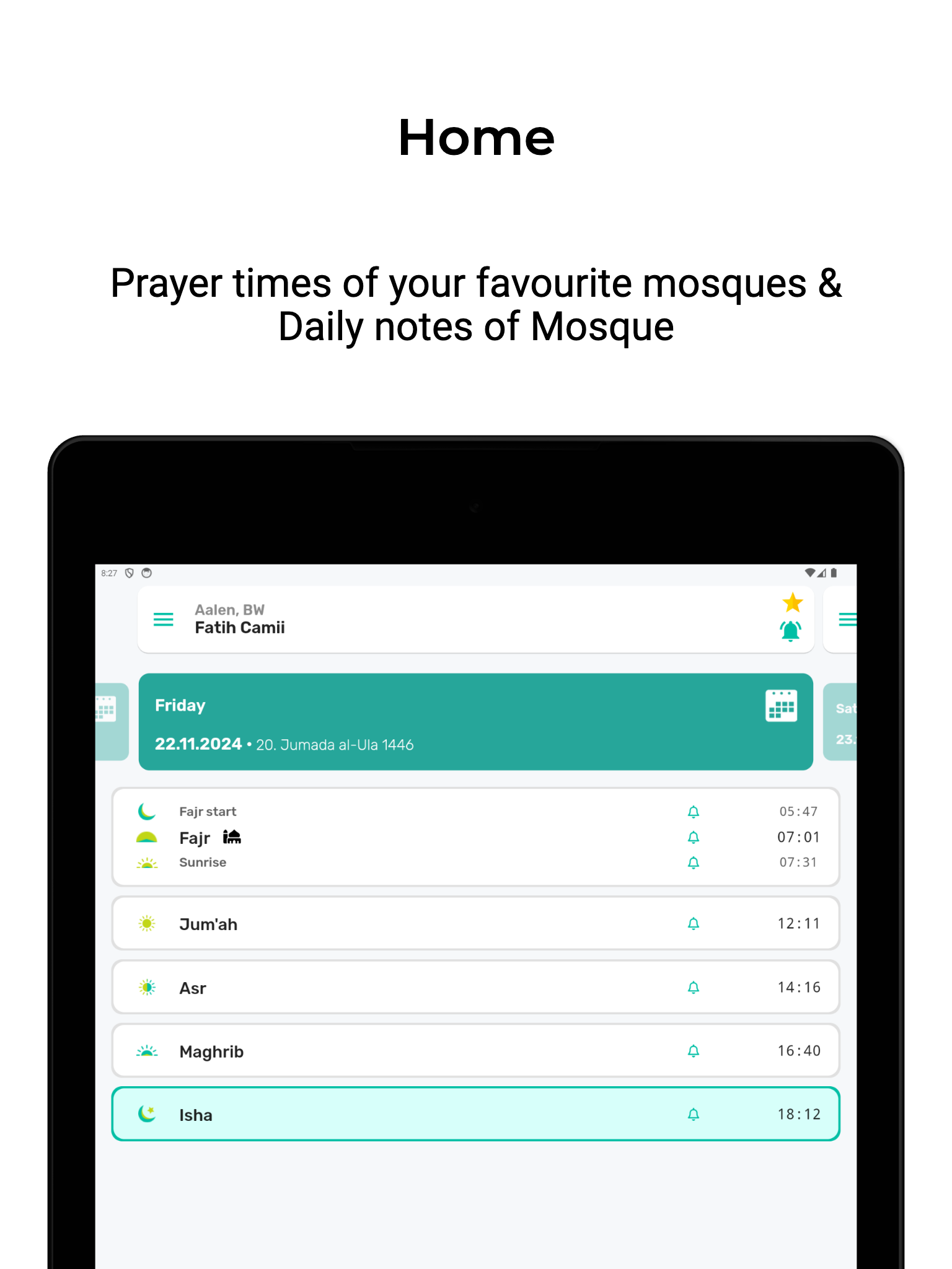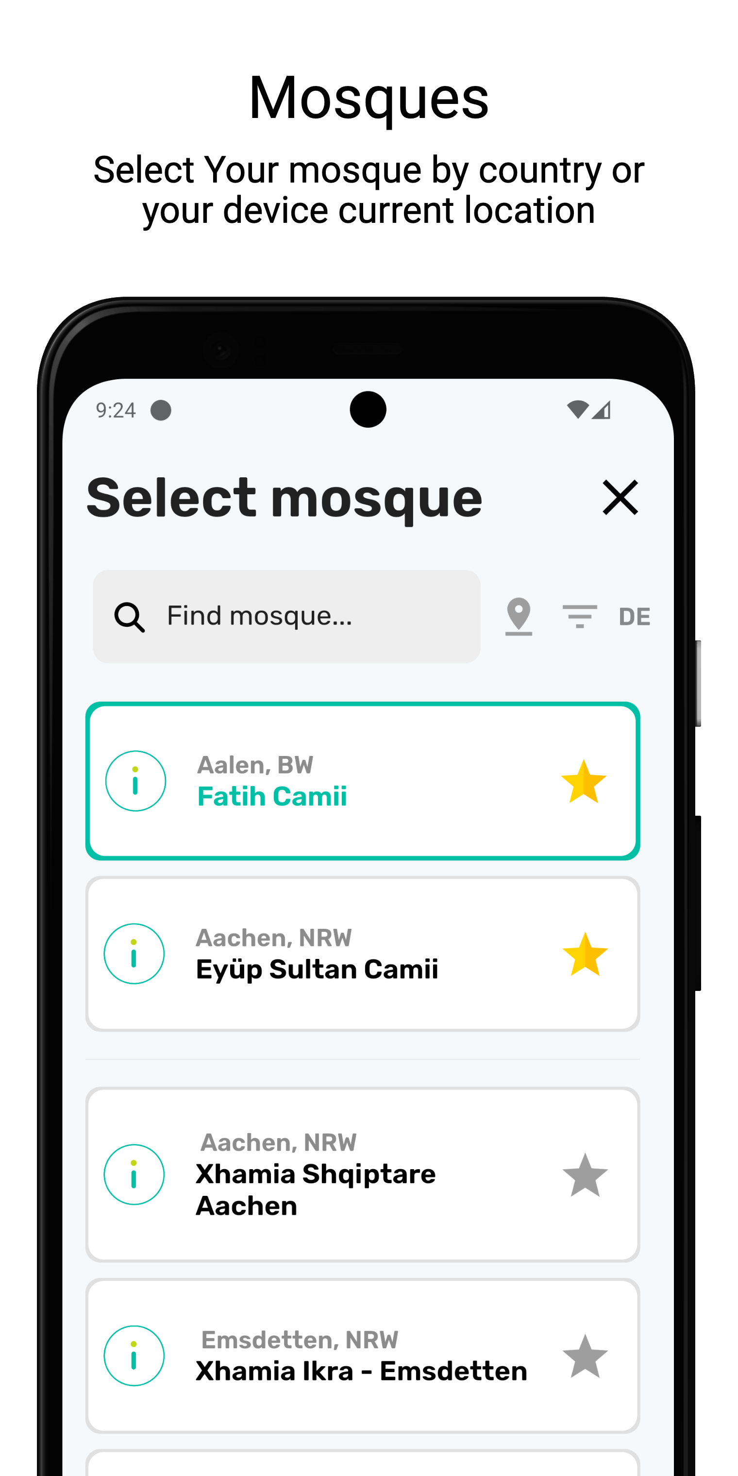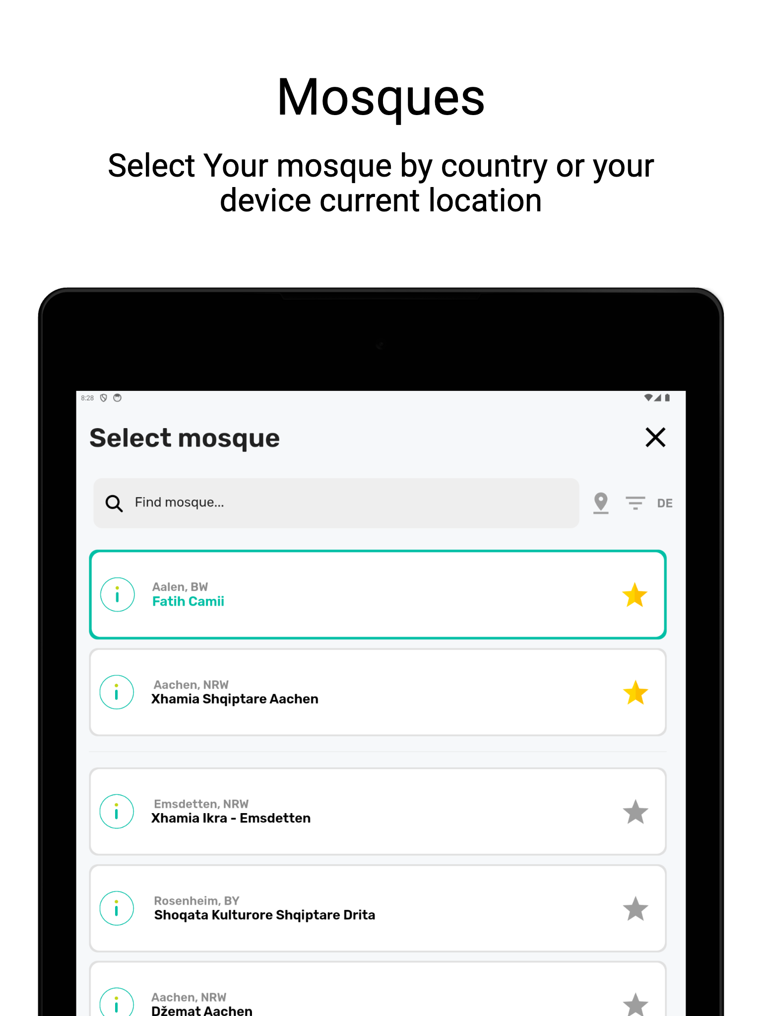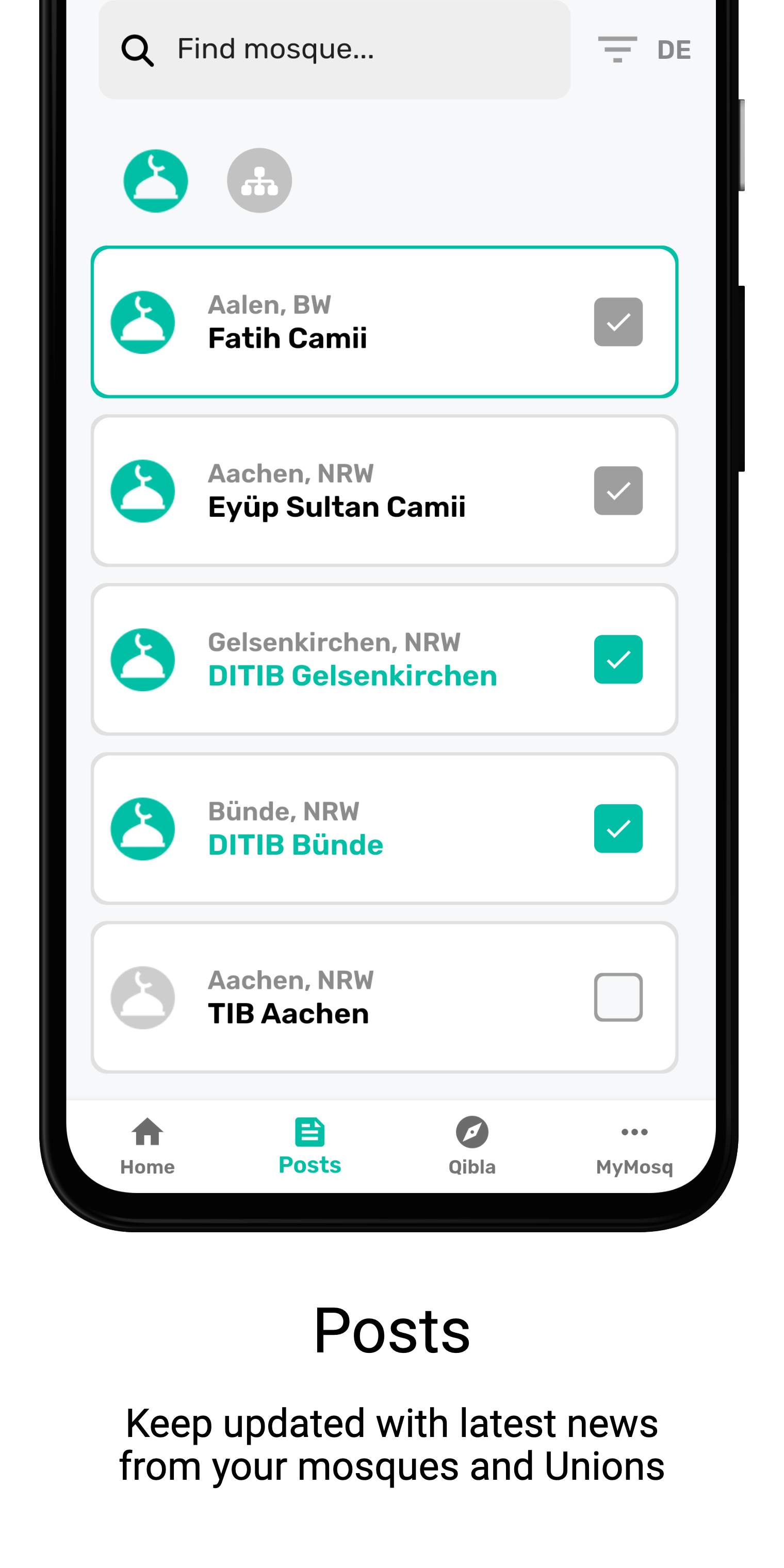 MyMosq is a smartphone app and a web platform offered to the Muslim community, which enables one to: - find the nearest mosque - get detailed information about specific mosques - show daily prayer times including mosque-adjusted times - subscribe to a mosque for daily notes - subscribe to push notifications for news from different mosques simultaneously