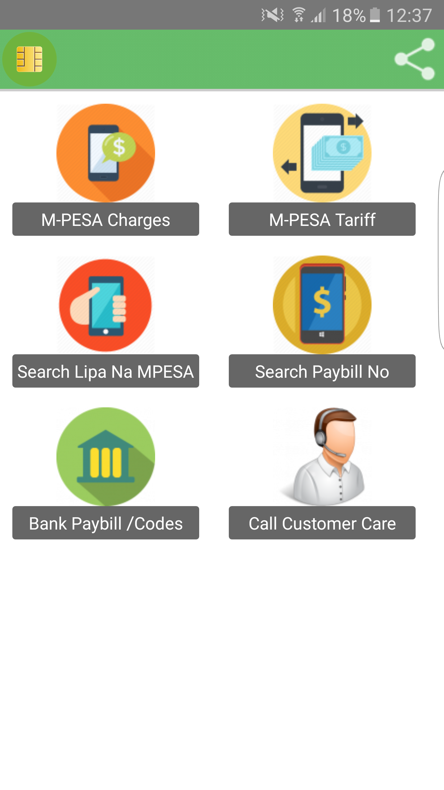 This application will help you with the following: 1. Get M-PESA charges/cost of transactions 2. Search PAYBILL and LIPA NA M-PESA numbers 3. Search Banking USSD Codes and PAYBILL Numbers for all banks 4. Help you CALL CUSTOMER CARE without waiting 5. Provides you with Direct number to customer care for M-PESA Reversals