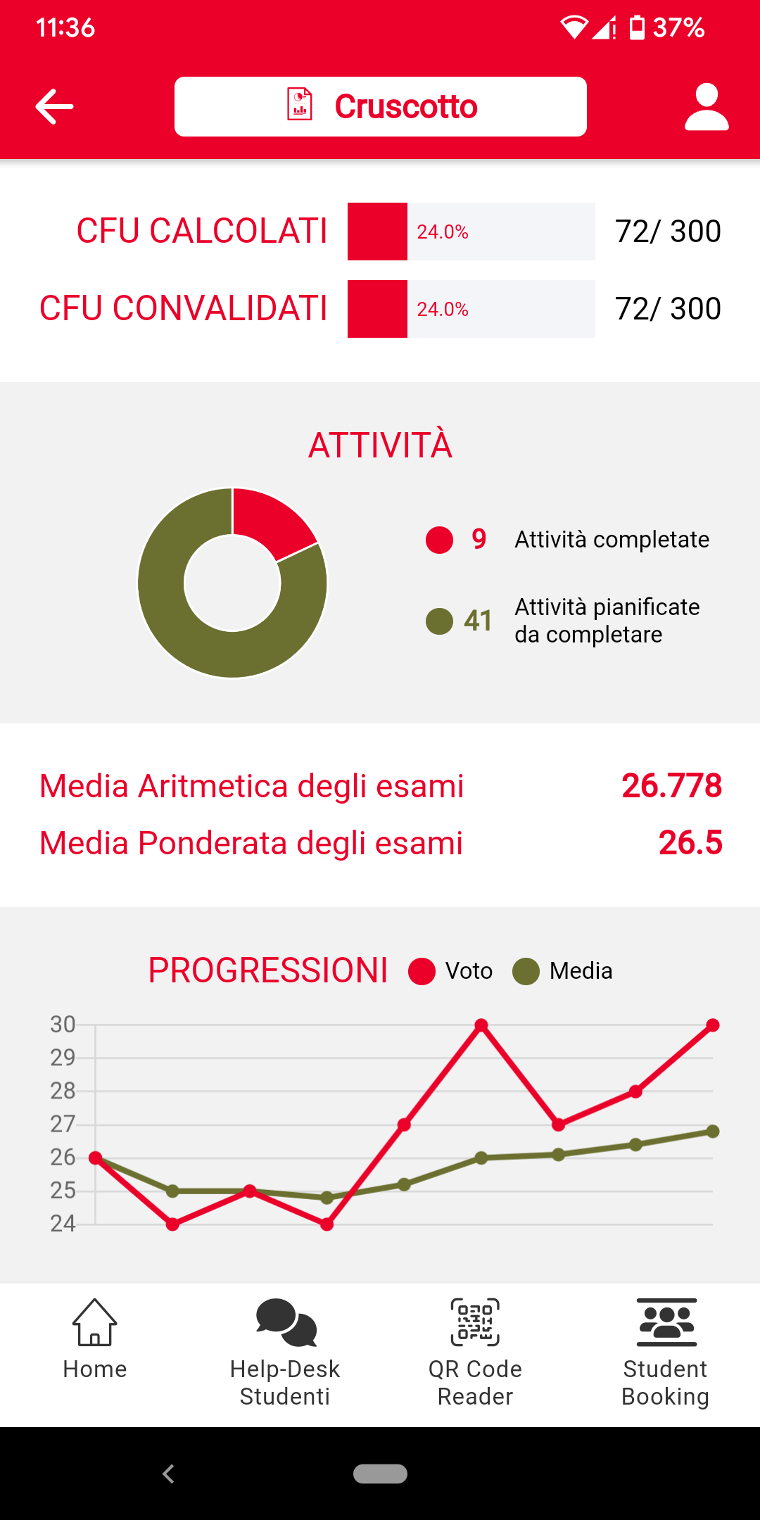 • Viewing the status of their studies on the Dashboard. Credits awarded (or not) will be shown on the first pie chart in relation to the total amount of credits available for your course. The second pie chart shows the trend of the marks over time and on average for the exams passed.