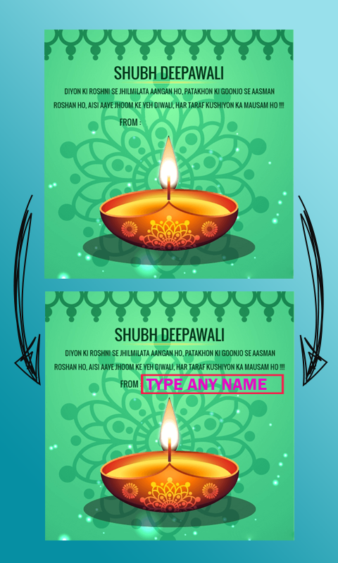 "Diwali Dhamaka" If you love to celebrate your holy festivals by sending greetings to your dear ones, Name Diwali Greetings Cards is a best tool to edit your new and amazing greetings. Through this app you can write your name on your greetings with different color of text and fonts. Select your favorite greeting card from different varieties of cards and customize them with different text or naming. Main features: - Choose different cards to name out your Diwali wishes. - Add text like your name, your girlfriend name, boyfriend name or any message - Rotate your image to fit your design. - Various types of templates with suitable text fonts. - Easy user interface - Share your amazing pics with Whatsapp, Twitter, Fb etc. Your ratings and comments must be appreciating, so please encourage us with your ratings to publish more free applications...
