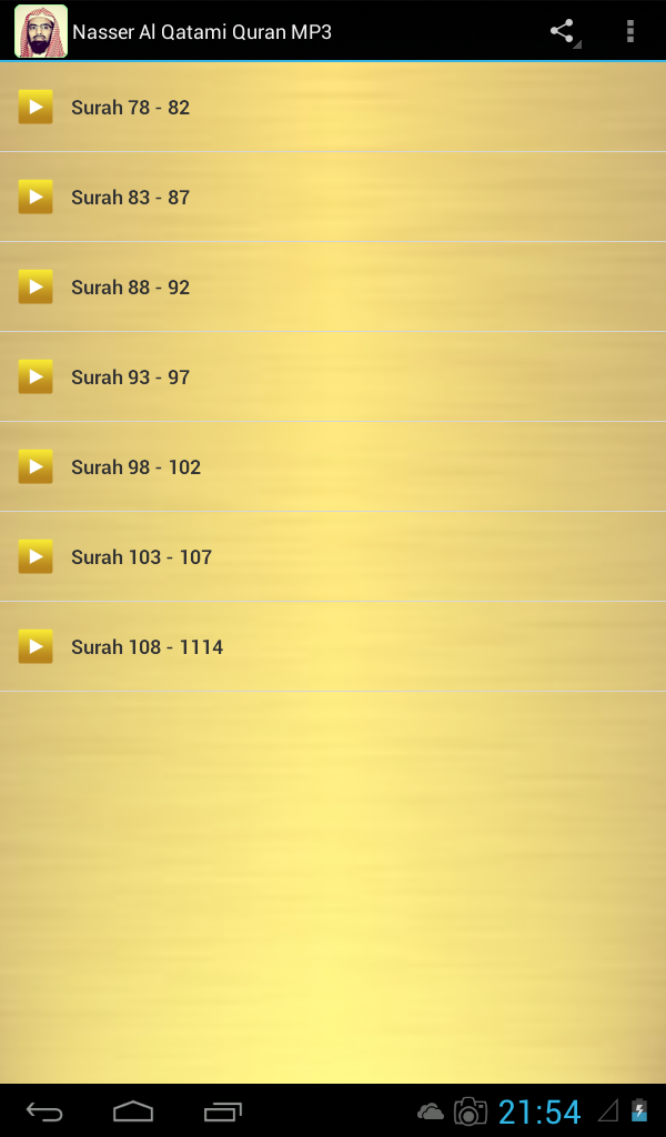 Nasser Al Qatami Quran MP3 (Package Name: yuumedia.nqatami) is developed by yuumedia and the latest version of Nasser Al Qatami Juz 30 MP3 1.1 was updated on April 14, 2018. Nasser Al Qatami Juz 30 MP3 is in the category of Lifestyle. You can check all apps from the developer of Nasser Al Qatami Juz 30 MP3 and find 18 alternative apps to Nasser Al Qatami Juz 30 MP3 on Android. Currently this app is for free. This app can be downloaded on Android 4.0+ on APKFab or Google Play. All APK/XAPK files on APKFab.com are original and 100% safe with fast download.