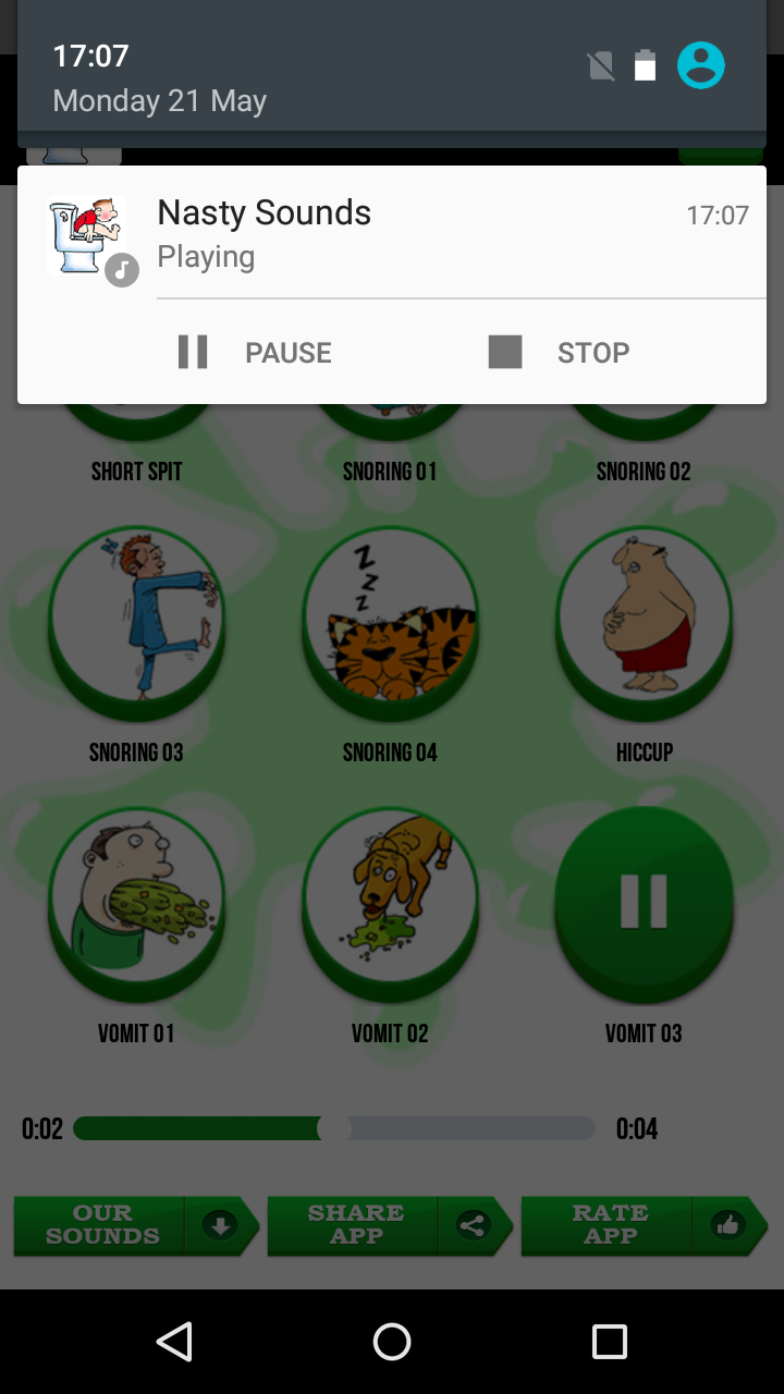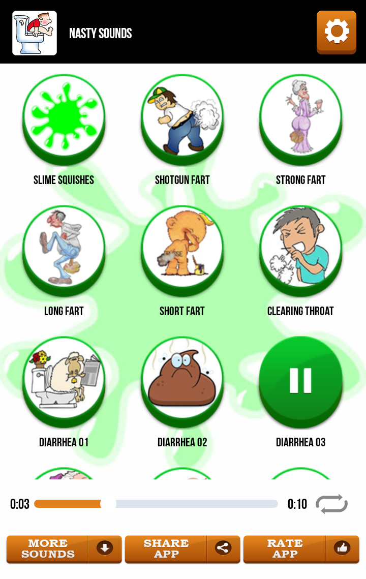 Nasty Sounds is a remarkably unique app which brings awkward collection of impolite and somewhat rude tones for alarm and call alerts. Your smartphone will attract attention every time someone contacts you! Here you can find the most churlish and spiteful SMS notification tones, amazingly unruly ringtones and loud nasty alarm sounds that will blow your mind! Assign different cool ringtones for each contact from your phone and enjoy unusually cool sound effects daily! These super ill-bred, boorish ringtones are just what you need to be different so download them now, completely free of charge and enjoy the best weird sound effects! * All ringtones are preloaded inside the app and FREE to use. * Set as ringtone, SMS/e-mail notification, alarm sound or assign as ringtone to specific contact in your contact list(PRESS AND HOLD PLAY). * Easy to use UI, Nasty Sounds App works in landscape and portrait mode, optimized for all tablets and smartphones. * Top new ring tones and SMS sounds! * Share your favorite sounds via social networks using the simple SHARE button. “Nasty Sounds” will put sour smile on your face every time you get a text message or e-mail. Enjoy most popular rude and nasty sounds and share them with your friends and family! Show your sense of humor wherever you are, every time your phone rings! Pick your favorite free ringtone from this sound effects soundboard and set it as an SMS alert, chat notification or alarm sound! Add special improper ringtone sounds for your less dear contacts – they will make you grin every time! Download these weird ringtones for free and enjoy the fun they will bring to your mobile phone! Show your sense of humor each time your smartphone rings! Whether you are at school, in the public transport or at work, everyone around you will be laughing out loud when they hear a sound coming from your phone. Unusually mean SMS sound effects are just what you need to brighten every day! Become the center of attention wherever you are! Laughter is healthy for you, and with these funny Nasty Sounds, you will have tons of fun so use them as stress relief daily! Everyone around you will LOL every time someone contacts you on your mobile phone. Nasty Sounds is the fantastic and most puzzling new app for your Samsung Galaxy or any other phone using Android™! You will have a blast with your friends every time your phone goes on! Enter the world of spiteful and unkind ringtones with these free new Nasty Sounds. There is something for everyone’s taste, funny odd and ill-mannered SMS notifications, “amusingly loud ringtones”, energizing and bizarre alarm sounds. Show everybody how strangely cool and hip you are. Feel free to contact us for any questions or feedback. ***All sounds in this app are registered under Public Domain or Creative Commons Attribution Liscence.