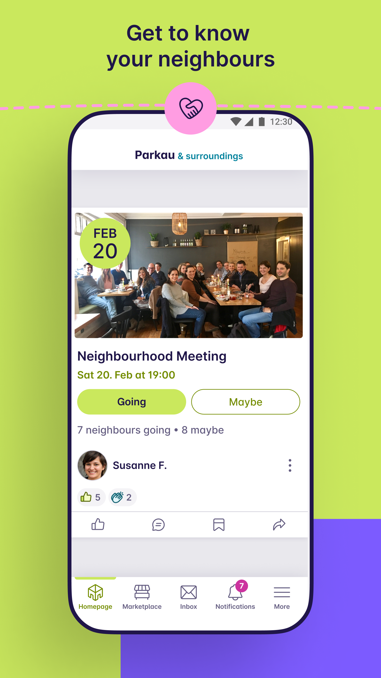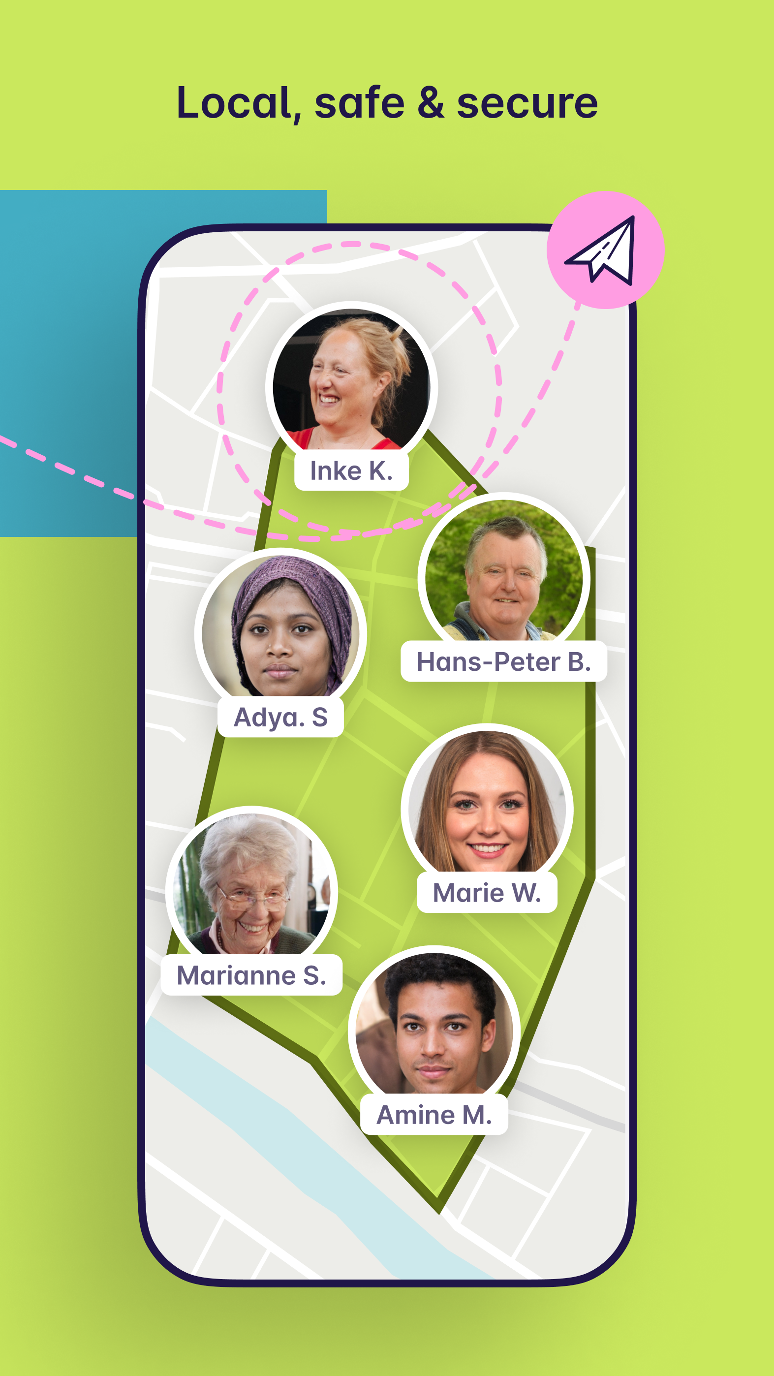 Become part of nebenan.de - your digital neighbourhood and Germany's largest neighbourhood network with three million users and more than 8000 active neighbourhoods. With the nebenan.de app, you can easily get in touch with people from your immediate locality, share news, discover local offers, and much more. Whether you're looking for a lost pet, need recommendations for maintenance workers, or want to find events in your neighbourhood – nebenan.de is your platform for a networked community. Join us and become part of a lively and supportive neighbourhood. DISCOVER LOCAL CLASSIFIED ADVERTS: • Give away, buy, search: On the nebenan.de marketplace, you can sell or give away furniture or find neighbours to help you set things up. NEIGHBOURHOOD HELP: • Neighbourhood help made easy: Are you looking for petsitting? A babysitter? Then ask in your neighborhood! A person next door doesn't have a drill and needs to lend one? Then offer your help. Mutual neighbourly help creates a trusting environment where everyone can feel at home. EVENTS IN THE NEIGHBOURHOOD: • At nebenan.de you can learn about all the events in your neighbourhood - from yard flea markets and games evenings to the next regulars' table. GROUPS FOR SHARED INTERESTS AND NEW FRIENDSHIPS: • Whether it's a running group, card games, or urban gardening: you can easily find new contacts at nebenan.de. Join an existing group or start one yourself. You'll get to know new people and neighbours will become friends. LOCAL SHOPS AND TIPS FROM YOUR NEIGHBOURS: • Are you looking for a new favourite café or can you recommend a good doctor's clinic? Are you looking for professional petsitting or babysitting? Use the app to find local businesses in your neighbourhood. FOR A GOOD AND SAFE NEIGHBOURHOOD: • Bike stolen, keys lost. Has anyone seen anything? Together for a safe and good neighbourhood, because four eyes see more than two. And with the app, you can stay informed even when you're out and about. CONNECT WITH YOUR NEIGHBOURHOOD IN JUST TWO STEPS: • Register securely with your name and address • We will then verify your address with one of our verification methods. This way we ensure that only real residents get access to the neighbourhood. • You've done it! You are now part of your neighbourhood and can connect with your neighbours. YOUR BENEFITS: • Easily find and meet nice contacts with similar interests from your neighbourhood. • Find local recommendations and events. • Trade things on the marketplace: Directly in your area. • Neighbourly help made easy: Neighbours help one another. • With the app, you are also connected on the go. ALL FEATURES AT A GLANCE: • Marketplace: local classifieds • Create, edit, and comment on posts • Create and find events • Write personal messages • Open and closed groups for common interests • Safe interaction: report spam or inappropriate messages - please also take a look at our rules & guidelines in our help centre We are always happy to hear from you! If you have any questions or suggestions, please send us a message using the following form https://bit.ly/4bGSwKq. Or take a look at our help centre: http://bit.ly/2v2bczX. Data protection is important to us. Our data protection officer: Jürgen Kempter, Good Hood GmbH, Köpenicker Straße 154, Aufgang H / 1. OG, 10997 Berlin