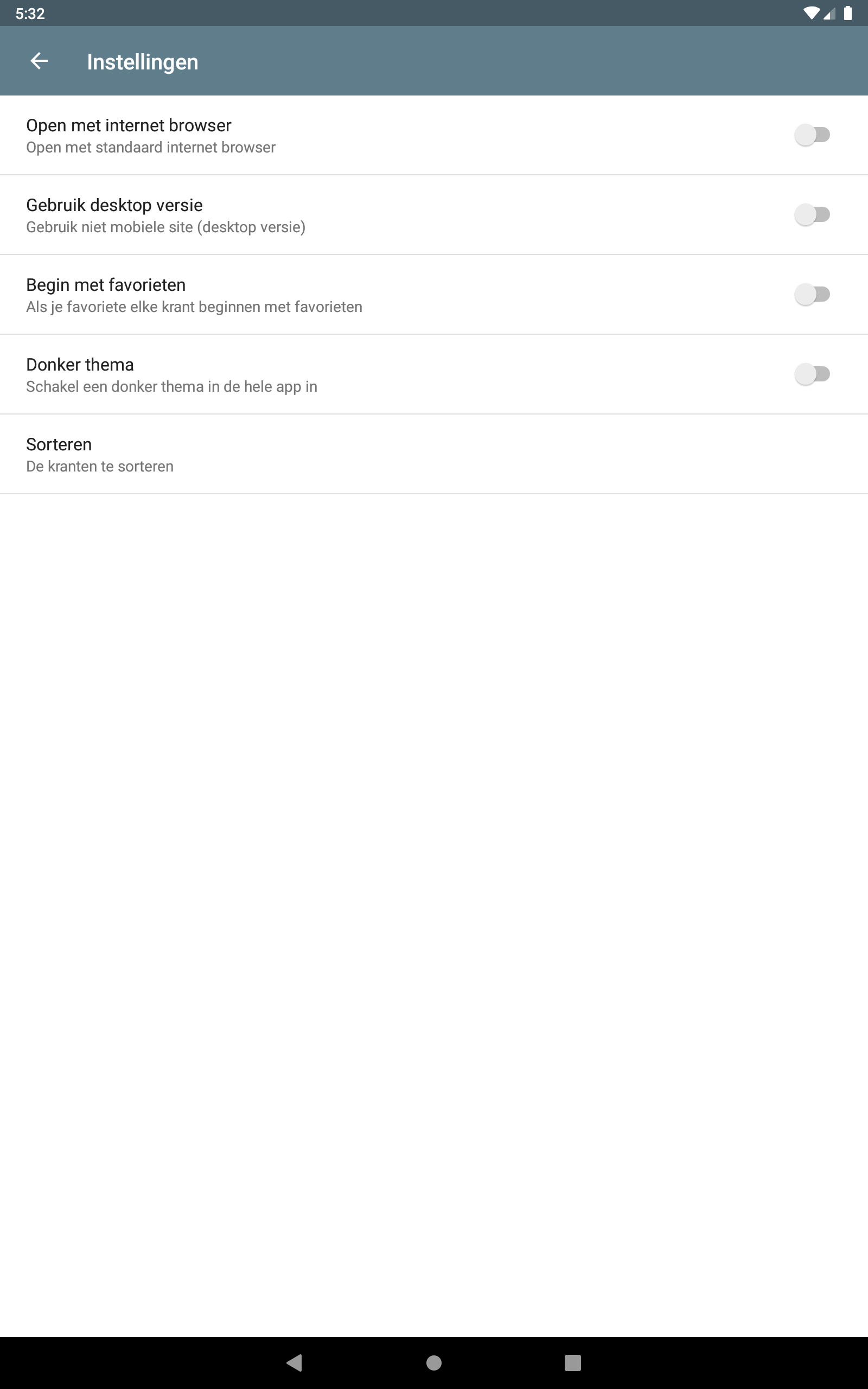 - Er zijn 2 modus van de applicatie: Desktop en Mobile. Desktop versie van de kranten kan langer duren om te laden. Controleer welke modus gebruikt u op de pagina Instellingen.
