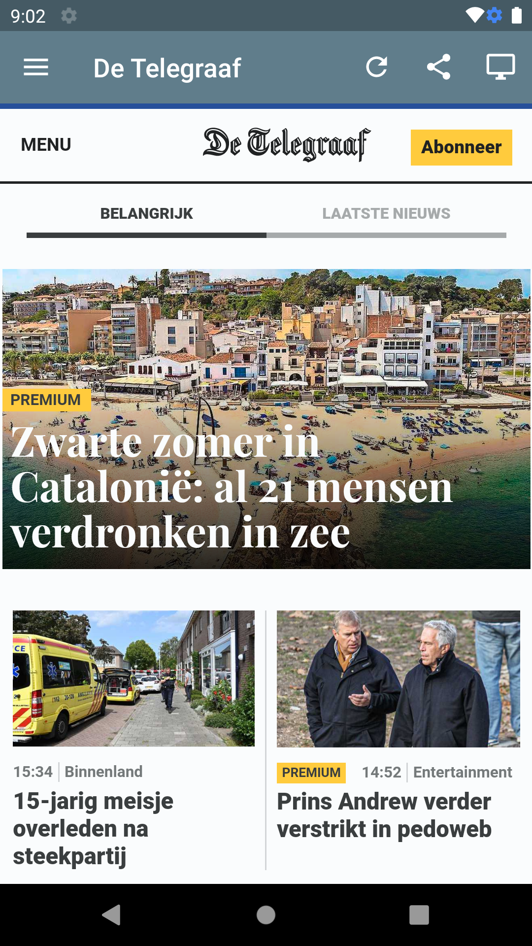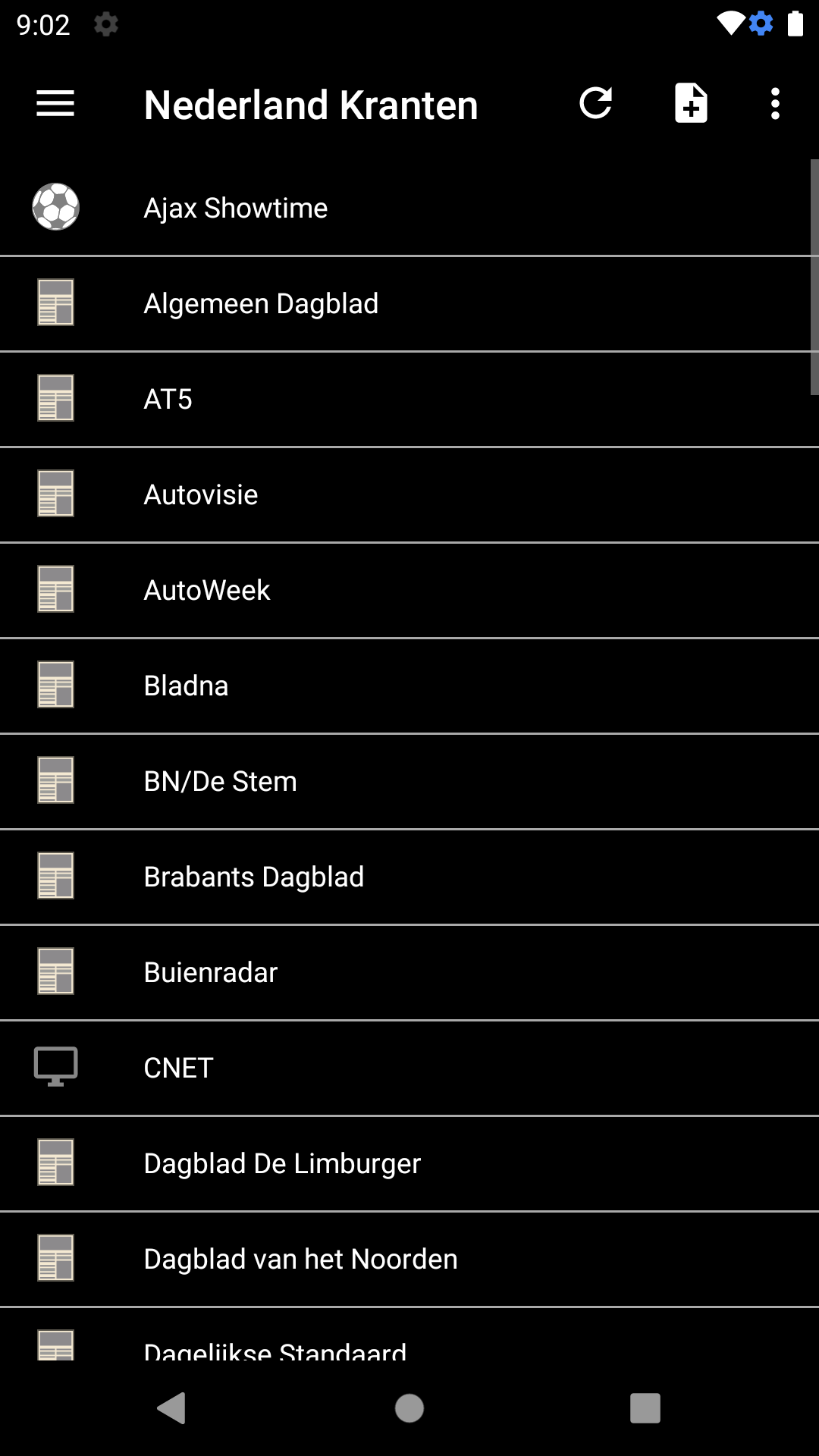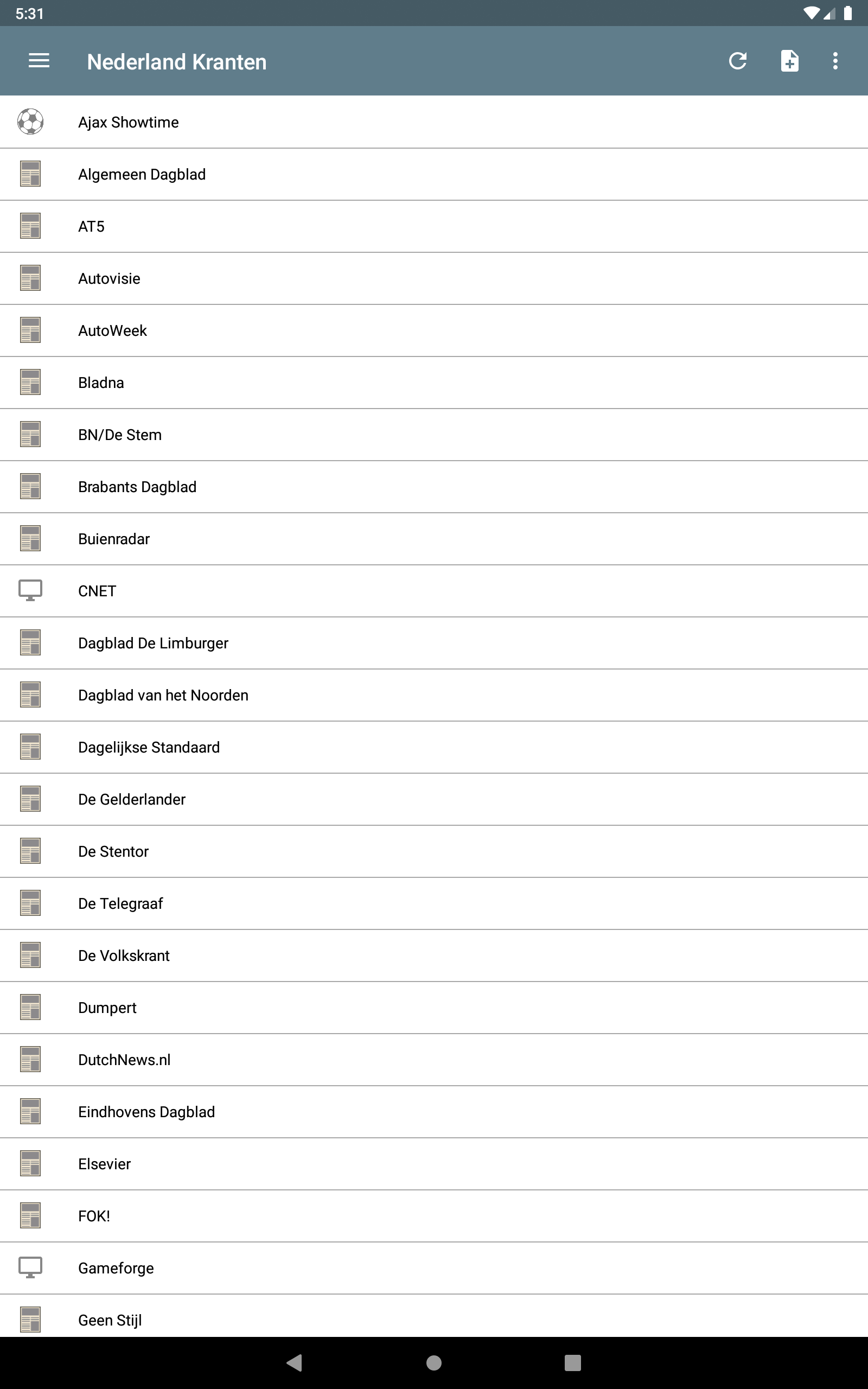 Lijst van de grote kranten Nederland, nieuws sites online. Vindt u nieuws van AT5, Algemeen Dagblad, Almere Vandaag, Autovisie, AutoWeek, BN/De Stem, Brabants Dagblad, Dagblad De Limburger, Dagblad van het Noorden, De Gelderlander, De Stentor, De Telegraaf, De Volkskrant, Digitaal, DutchNews.nl, Eindhovens Dagblad, Elsevier, FOK!, Google Nieuws, Geen Stijl, Gooi-en Eemlander, Haarlems Dagblad, Het Financieele Dagblad, Het Parool, IJmuider Courant, L1, Leeuwarder Courant, Leidsch Dagblad, Meppeler Courant, Metro, Nederlands Dagblad, Noordhollands Dagblad, NOS, NRC Handelsblad, NRC.Next, NU, Nusport, Omroep Brabant, Omroep Flevoland, Omroep Gelderland, PZC, Reformatorisch Dagblad, RTL Nieuws, RTV Noord-Holland, RTV Utrecht, Sp!ts, Trouw, Tweakers, Tubantia, TVGids, Voetbal International...
