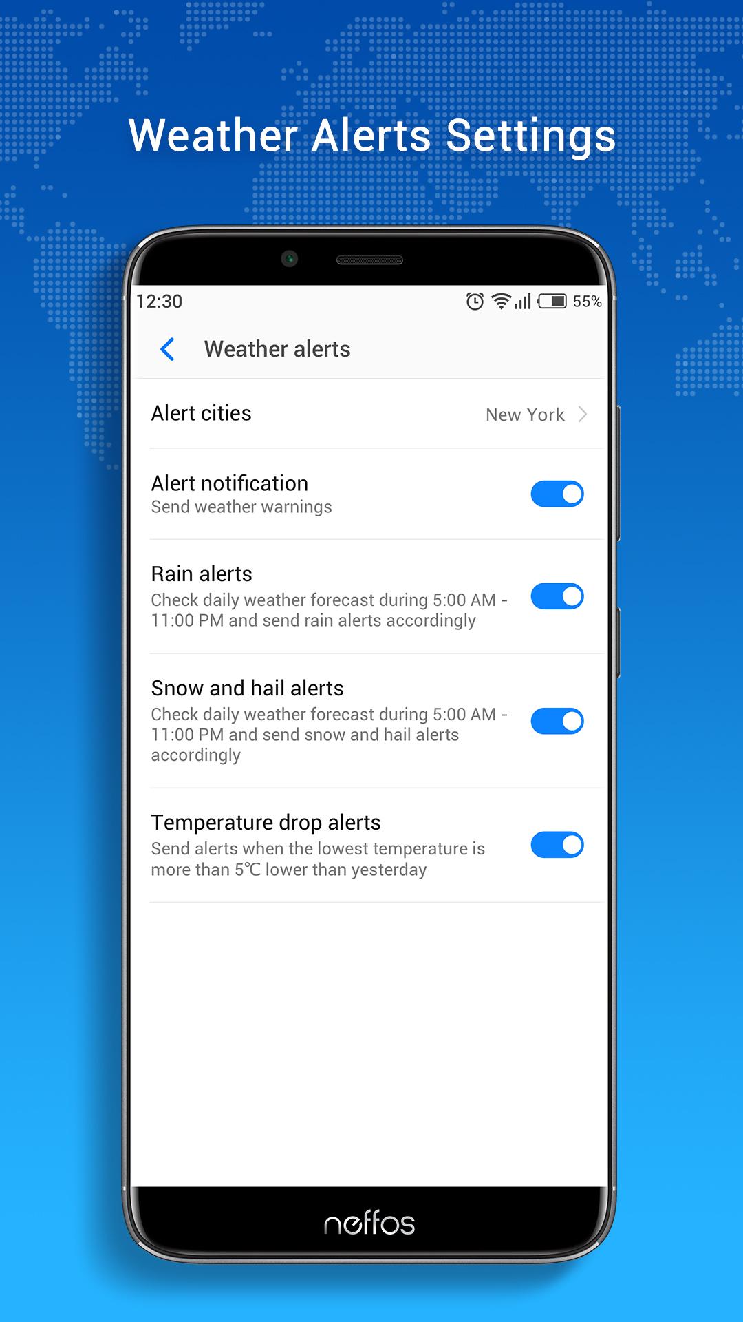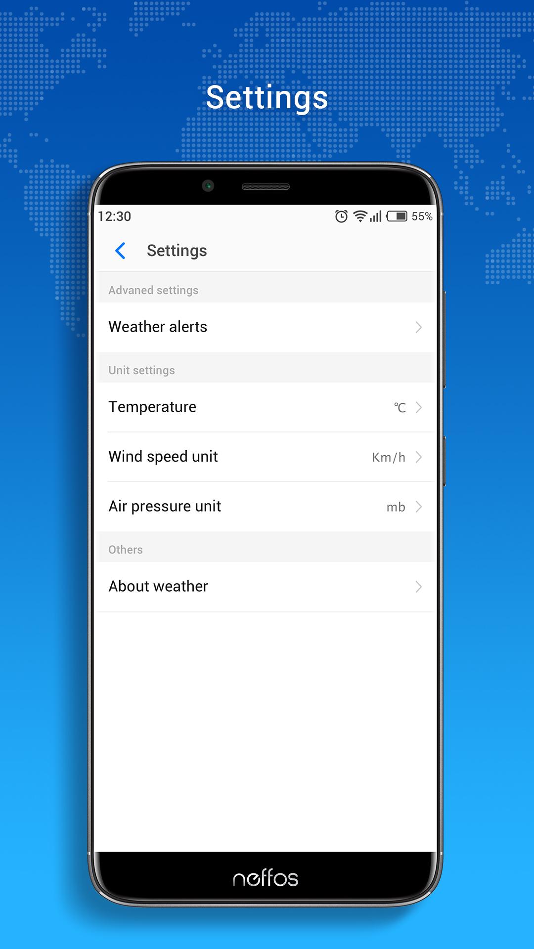 Product highlights — Accurate weather forecast: Neffos Weather works with the world's best weather data sources to provide you with the most accurate weather information at all times. — Precise positioning: No matter where you are, Neffos Weather can provide you with accurate local weather information. — Real-time weather display: Real-time display of current temperature, weather conditions and other information. — Weather change reminder: When the weather changes such as rain, snow, hail, and cooling in the alert city, Neffos Weather can send timely reminders to remind you to pay attention to weather changes. — Severe weather warning: when severe weather is expected in the alert city, Neffos Weather can send weather warning notices in time to remind you to take precautions against bad weather. The weather warning feature is currently available in most European countries, USA, Canada, Australia, and Japan. — Support multiple languages: support more than 20 languages such as English, German, French, and Arabic. Custom desktop widget Neffos Weather offers three widget styles for your free choice: “current weather” widget, “time + current weather” widget, and “current weather + future weather” widget. We hope you enjoy Neffos weather app, thank you for your support.