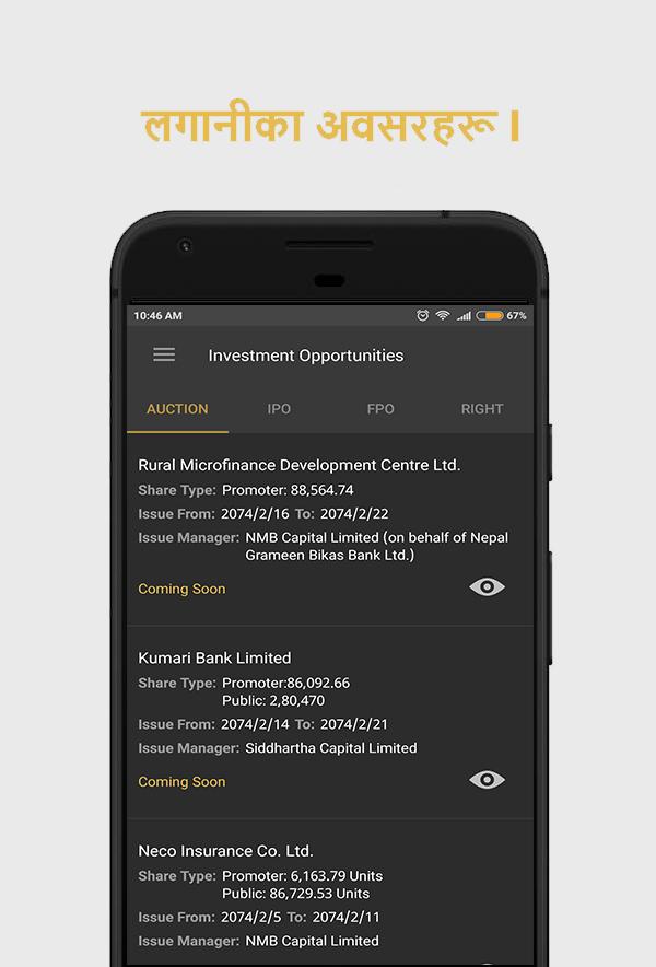 Nepali Paisa app gives easy and detailed access to Nepal Share market news, nepal share market data, numerous tools, indicators, reports and much more. Whether you want to get an idea on the breaking financial news, refer to historical data of a company to make your analysis or use our analysis and get rid of the tiring process of making a report, Nepali Paisa has everything embedded in its app. Users can get free access to NEPSE report and technical analysis report every week through our basic service. Using our premium service, users get access to in-depth technical and fundamental analysis report every week and can also monitor their stock portfolio whenever and wherever they want, just with the access to the internet. Get updated! Stay informed!! Features of Nepali Paisa Mobile App - Nepal Share market news - NEPSE data - All listed companies information - IPO calculator - Stock Screener - Updates on announcements and stock events. - IPO, FPO, Auction and Right Share news and updates. - Get a weekly – Technical Analysis and Nepse Report as a basic user feature - Get a weekly - In-depth Technical Analysis and In-depth Fundamental Analysis report as a subscribed premium user feature. - Build and customize your own portfolio to keep yourself updated with your stock position. Enjoy our latest release and stay tuned for the upcoming versions for additional services.