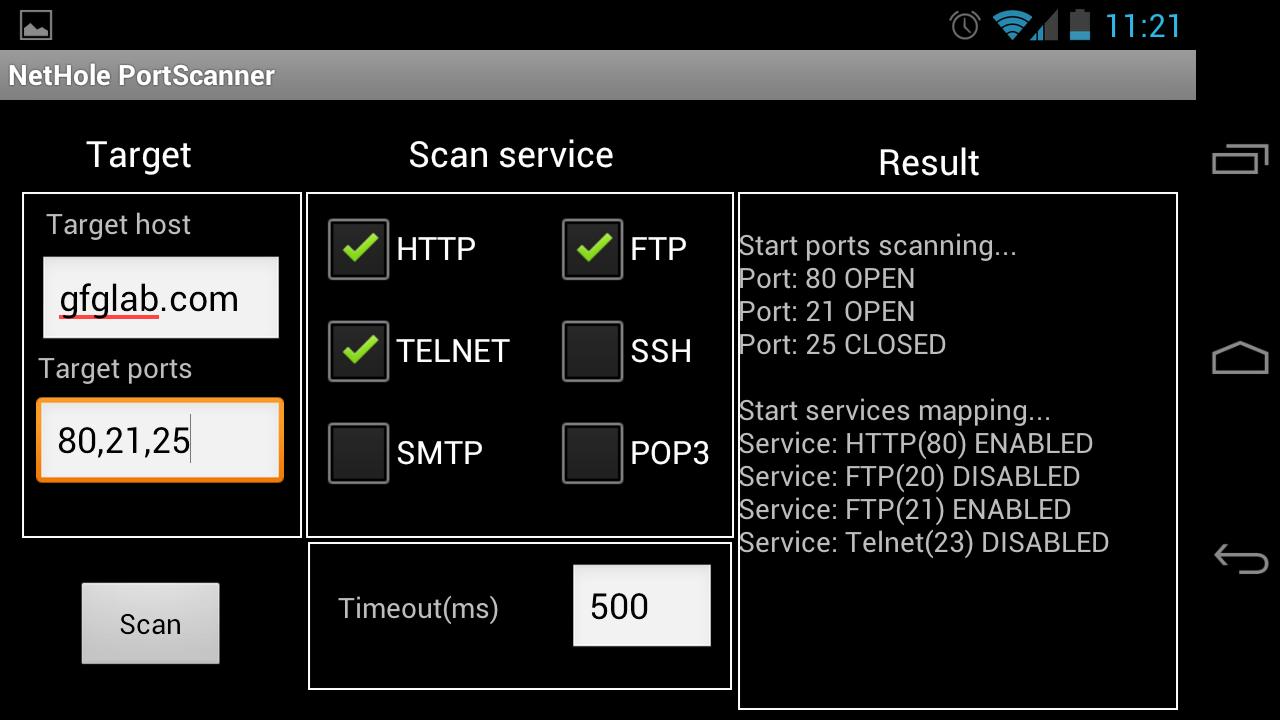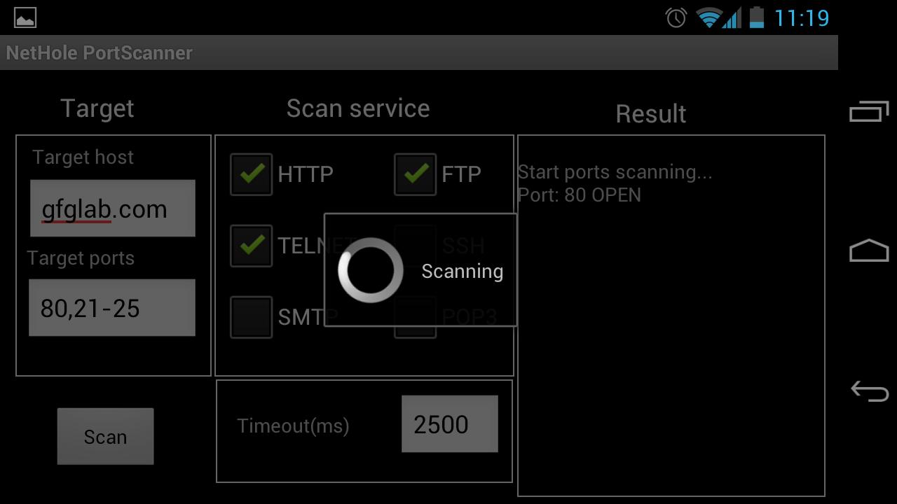 This application is a portable port scanner that scans the ports of a remote host and lets you know which are open. Application features: -Ability to scan individual ports -Ability to scan a range of ports -Ability to scan multiple services. -Support of 3g and wifi protocol. -Ability to set timeout for a single scan.