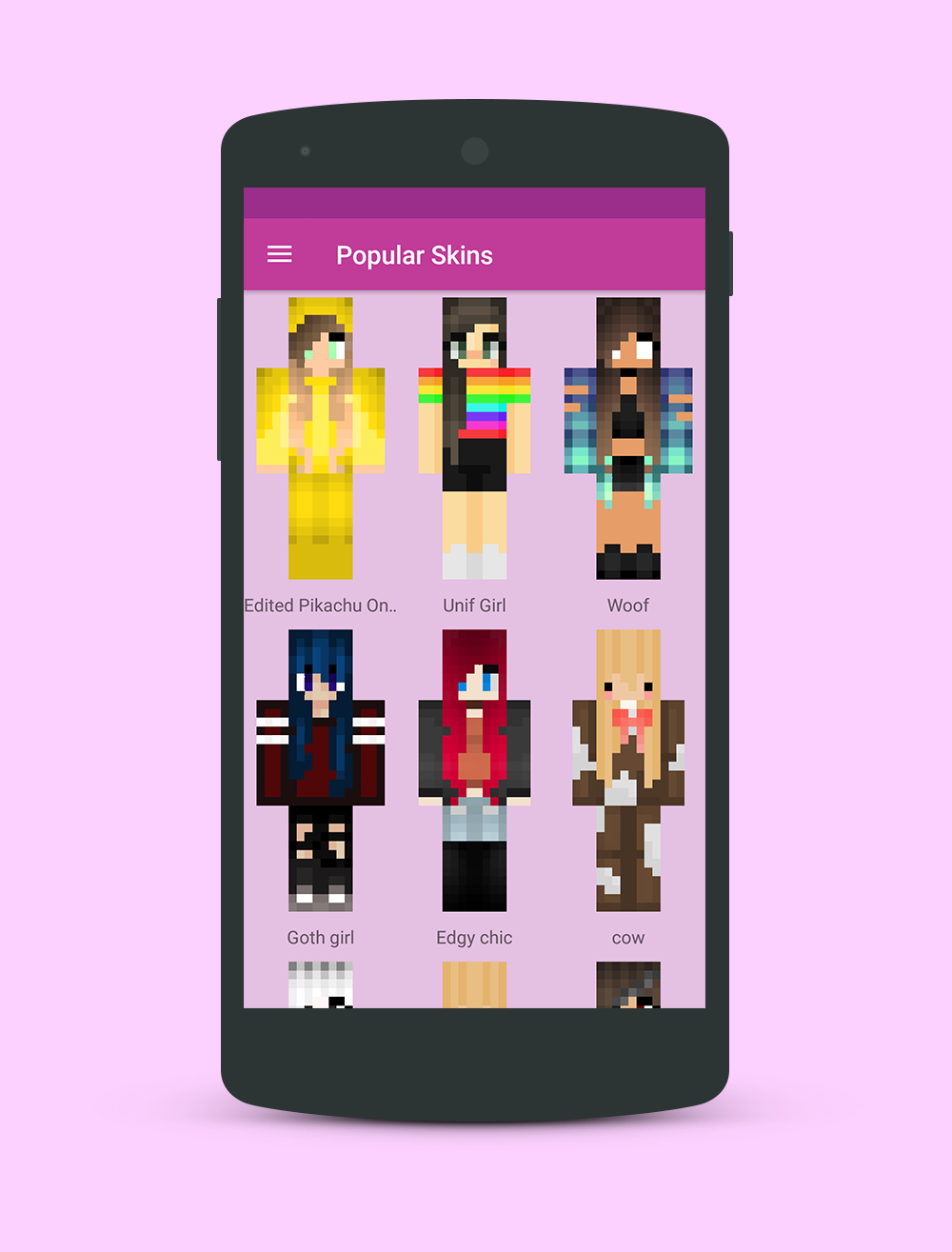 More than 800+ New Top and Best Skins for your favorite game! Skins for girls, vampires, horror skins, hot skins, princesses, bikini swimwear, skin bendy, robots, mermaids, unicorn, skins of bloggers, skins of angels, skins of cats, skins with ears, skins of noobs, animal skins, zombies, hebrin , raincoats, skins of kids and many others. All these skins you can apply to the version of Minecraft Pocket Edition! New Girls Skins for Pocket Edition will give you the opportunity to select and apply the skin completely free of charge and with just one finger touch! You can install skins without using any launcher. After installing the skin, you can play a new, cool character, even in multiplayer and on any servers. By installing a new skin, you can change the look of your server in the world of Minecraft. Download free girls skins for Minecraft PE and enjoy the game with new characters! Features: - Quick and easy to download skins with one click - Free and without internet - Preview skins - Skins of popular people and heroes - Skins work offline and with mod - The newest skins New Girls Skins for Minecraft is an unofficial game app. This application is in no way associated with Mojang AB. All trademarks and assets of Minecraft are the property of Mojang AB or their respected owner. All rights reserved. In accordance with http://account.mojang.com/documents/brand_guidelines