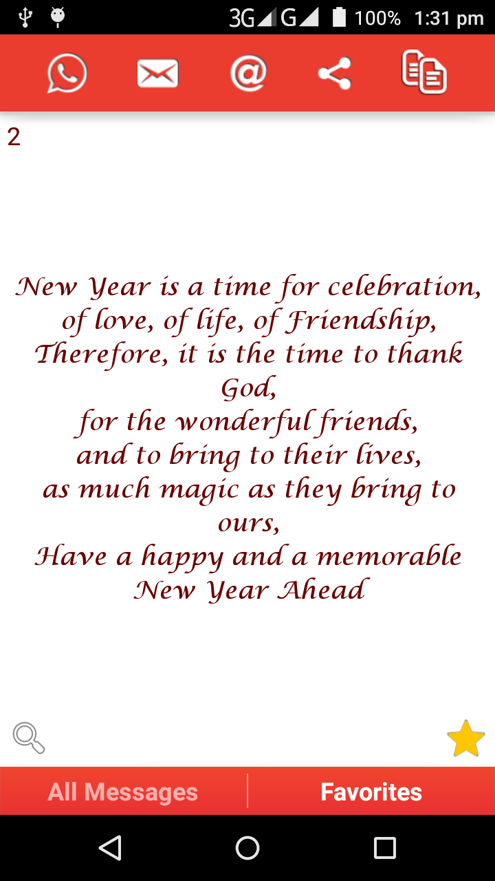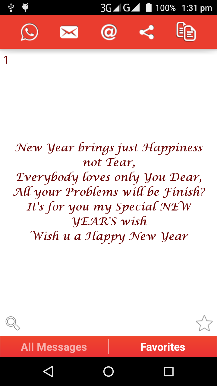 == Happy New Year - Diwali SMS, Wishes & Messages == This app helps you for wishing a happy New Year to your family and friends. It’s contains several nice sms & wishes. Just choose a message by swapping on device, read it & share. Features: - Big collection of New Year SMS, Wishes, Messages & Quotes. - Share your best wishes via Facebook, Twitter, Email, SMS etc. by single tap to your friends & family. - Choose your favorite messages from the list and mark it as a favorite ------ "Wish u a Happy New Year" to you and your family. ------