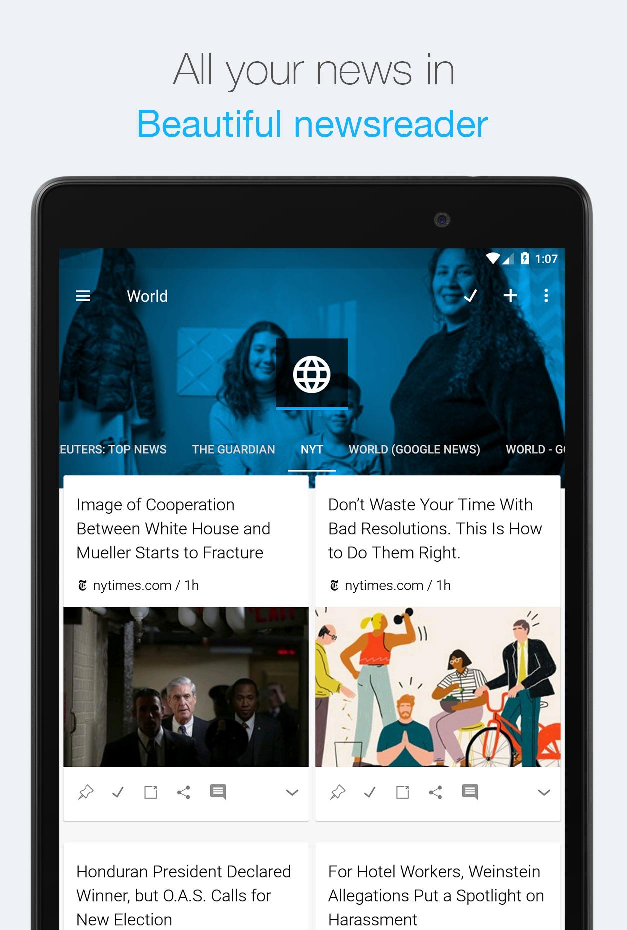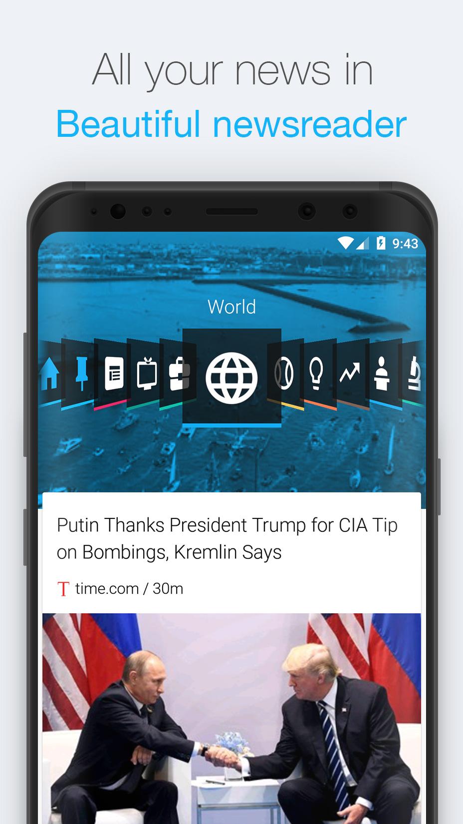 Add any RSS feed, news site, blog, Google News topic, Google Alert or Twitter hashtag. Simply find your favorite news sources in over 130 regions and languages (local news, world news) and organize your news by interest. Get smart news feed with the best of everything you follow, daily news digest, and breaking news notifications.