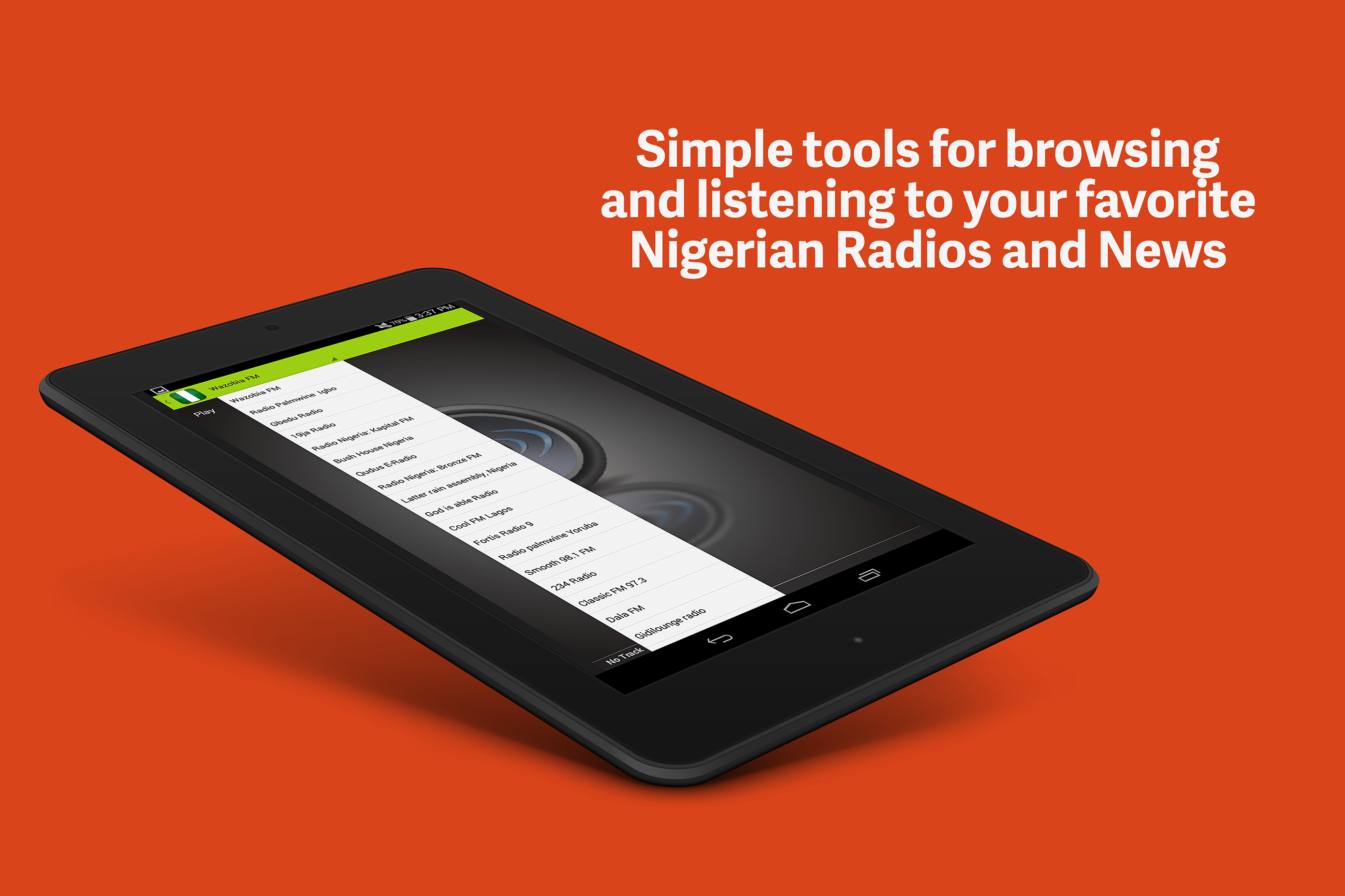 Nigerian Radios and News brings collection of your favorite radios and FM stations from Nigeria streaming live on your android devices.Now enjoy listening to the online radio broadcasts and music from Nigeria live on your android phones and tablet devices with just tap of a button. You can also access the latest Nigerian news and read your daily horoscopes through this app. Best of all, you get to access Nigeria radios free !! Now including radio Evangelo Nigerian Radios include, Gbedu Radio,Nigeria 19a Radio,Nigeria Radio Nigeria: Kapital FM Bush House Nigeria Qudus E-Radio,Nigeria Radio Nigeria: Bronze FM Latter rain assembly, Nigeria God is able Radio Praise world gospel radio Magic 102.9 Aba Nigeria Royal FM 95.1 Ilorin Nigeria Radio Abuja of Nigeria PS: All the Nigerian radios streams are live streams and therefore will only be available 24 hours if the radio stations broadcast 24 hours. Those stations that broadcast limited hours will be available only when it is broadcasting live in Nigeria local time. Please rate this app and leave any comments or suggestion you may have.