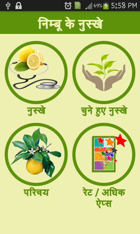 Nimbu(Lemon) ke Gharelu Nuskhe in Hindi application is collection of lemon home remedies for common problem which individual has in its daily life the problems like fever,constipation, controlling dysentery, vomit, stone,indigestion,clearing out the poison from the body, cough and phlegmatic disease,destroying worms in the stomach etc.