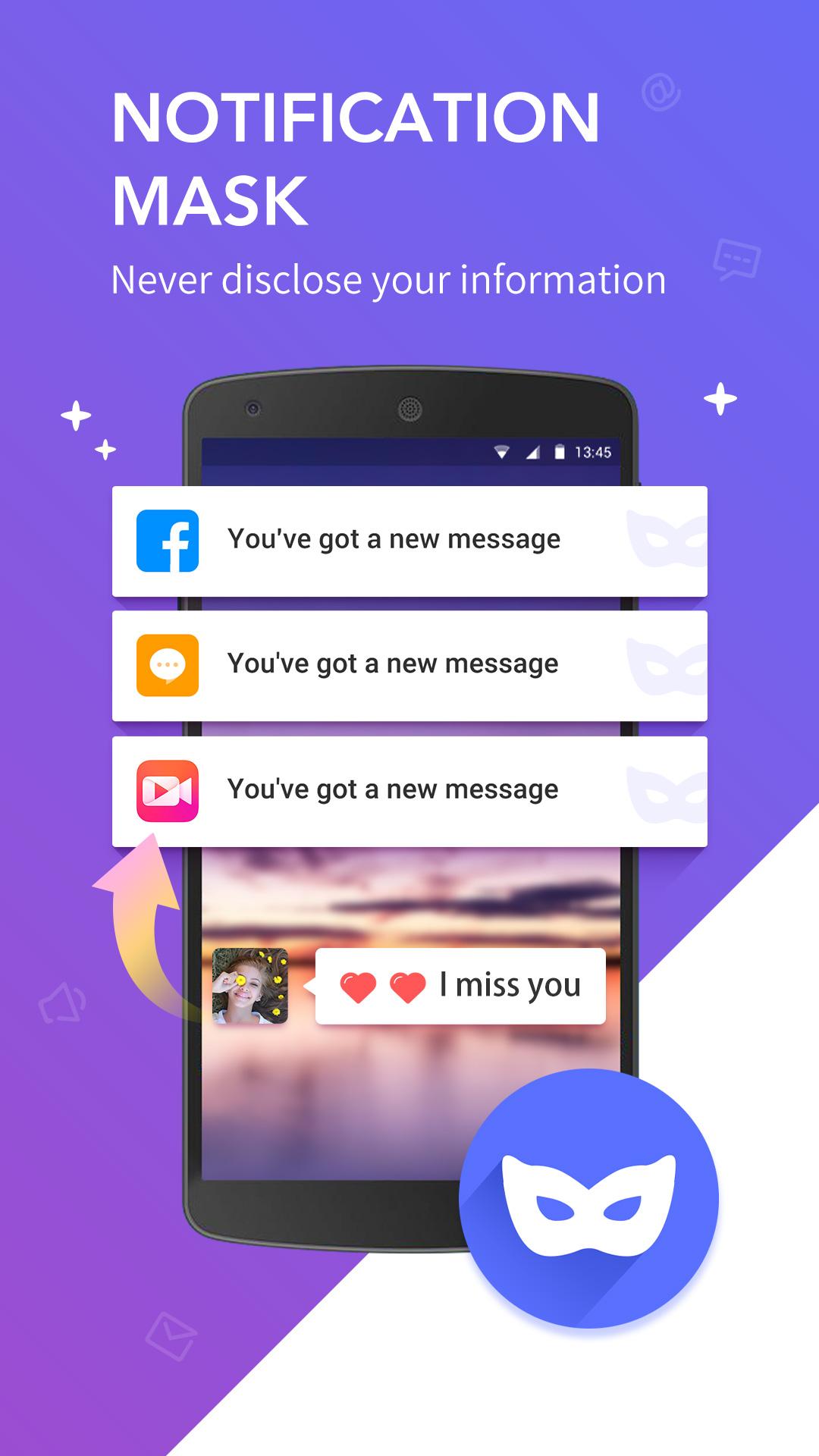 Do you have secret messages that you do not want to be seen by someone else? Do you wish not popup new notification at some times? If the answer is yes, then Notification Guard is the best notification app for you. Notification Guard is a great notification hider and message blockerwhich can protect your new messages like Whatsapp messages, Facebook messages, text messages etc. It provides various functions such as Notification mask (hide notification), Do not disturbnotification (block new messages with one key), Message box (hidden message management), Cleanup notification bar. Function highlights Small and powerful- Notification Guard's installation package is very small and provides the most powerful function of its kind; Simple and friendly - The usage of Notification Guard is simple, interactive and its interface design is very friendly, and very easy to use; Convenient and quick - It provides a notice bar shortcut tool, one click can meet your needs. Mask App Notifications–mask your privatemessage Set different mask patterns for your app to avoid secret messages (such as Whatsapp messages, Facebook messages, text messages) from being seen by others. Normal mask Hidethe notification title and content of the app, showing only the app's icon and number of notifications. When the app is set to normal mask, will hide notification content of the app, but will still show the hidden messagessent by the app. Normal mask is suggested to mask private messages of common socialapps, such as Whatsappmessages, Facebook messages, text messages, etc. Mask as text messages Hide the notification content and icon of the app, and mask the notification sent by the app as a text message. When the app is set to Mask messages, the notification sent by the app will be completely masked as receiving a new text message, and the icon app and notification content are completely hidden. It is recommended to mask higher privacy app to prevent the disclosure of the secret messages. Mask as Facebook massages Similar to Maskas text messages, Mask as Facebook massages will hide the notification contents and icon of the app, and mask the notifications sent by the app as Facebook messages. When the app is set to Mask Facebook massages, the notification sent by the app will be completely masked as receiving a Facebook message, and the app icon and notification content are completely hidden. It is recommended to mask higher privacy app to prevent the disclosure of the secret messages. Mask keywords–hide notifications including keywords When set some keywords, such as lover’s name or nickname of someone, to mask keywords, the notifications including keywords will hide content and only show app icon and notification numbers. Do not disturbnotification-block notification with one key Is it very embarrassing whennewnotifications popupat important times? Is it annoying when new notifications popup at break time? Notification Guardis a good notification and message blocker for you. Use the Do not disturbnotification to open the Do not disturb mode with one key, block messages and notificationsof all apps, and will not pushnew notifications. Message box– hidden message management When the Do not disturb mode is turned on, the blocked message will be stored in the Message box, and you can open the Message box to view the hidden messages. Click hidden messageand you can access the app directly. Also you can cleanup the hidden messages with one key. Persistent notification bar - shortcut toolbar Pull down the system notification bar, you can open or close the Do not disturb mode with one key, which is faster and more efficient. And the shortcut toolbar displays the number of messages stored in the Message box in real time, which allows you to quickly access the Message box to view the hidden messages. When there are too many notifications at the notification bar, just click the clean button on the toolbar to cleanup the system notification bar.