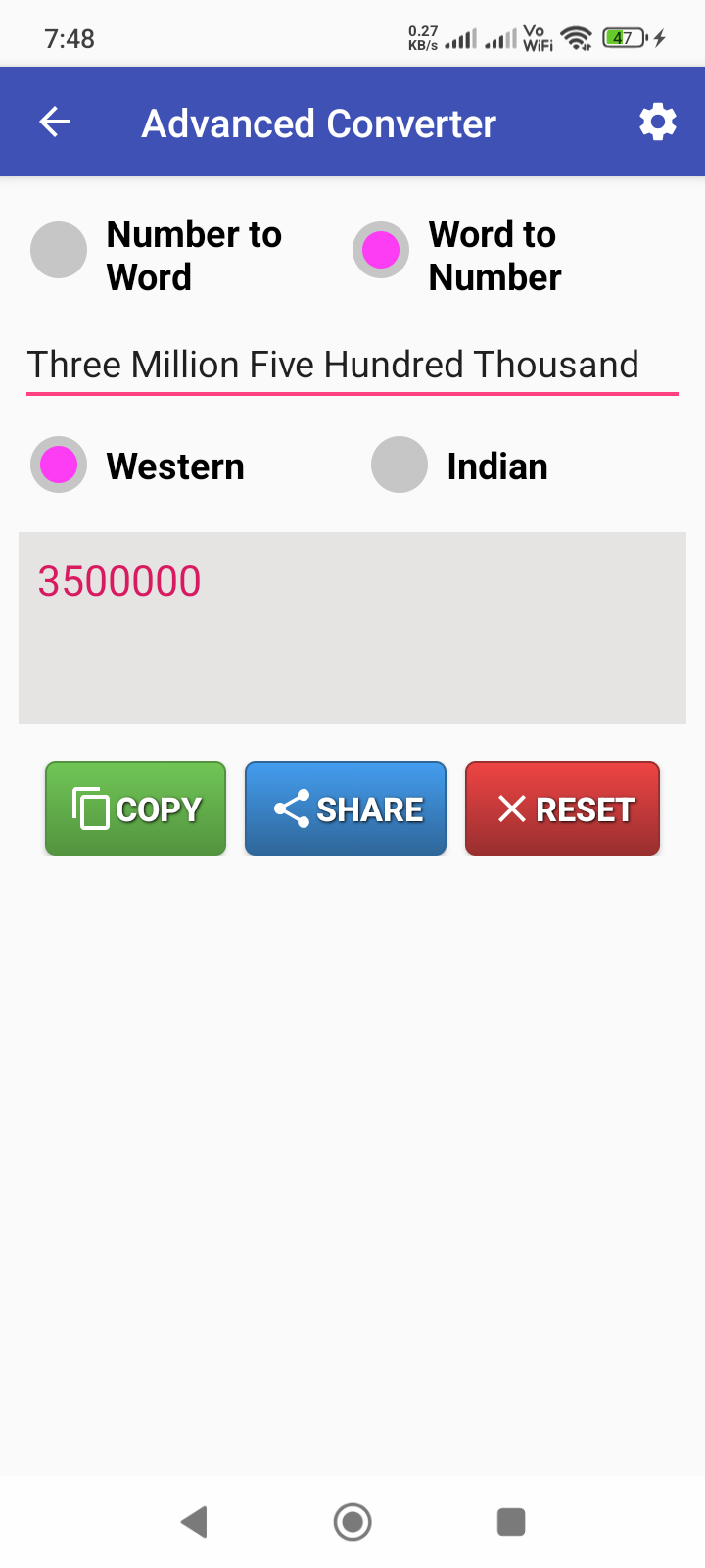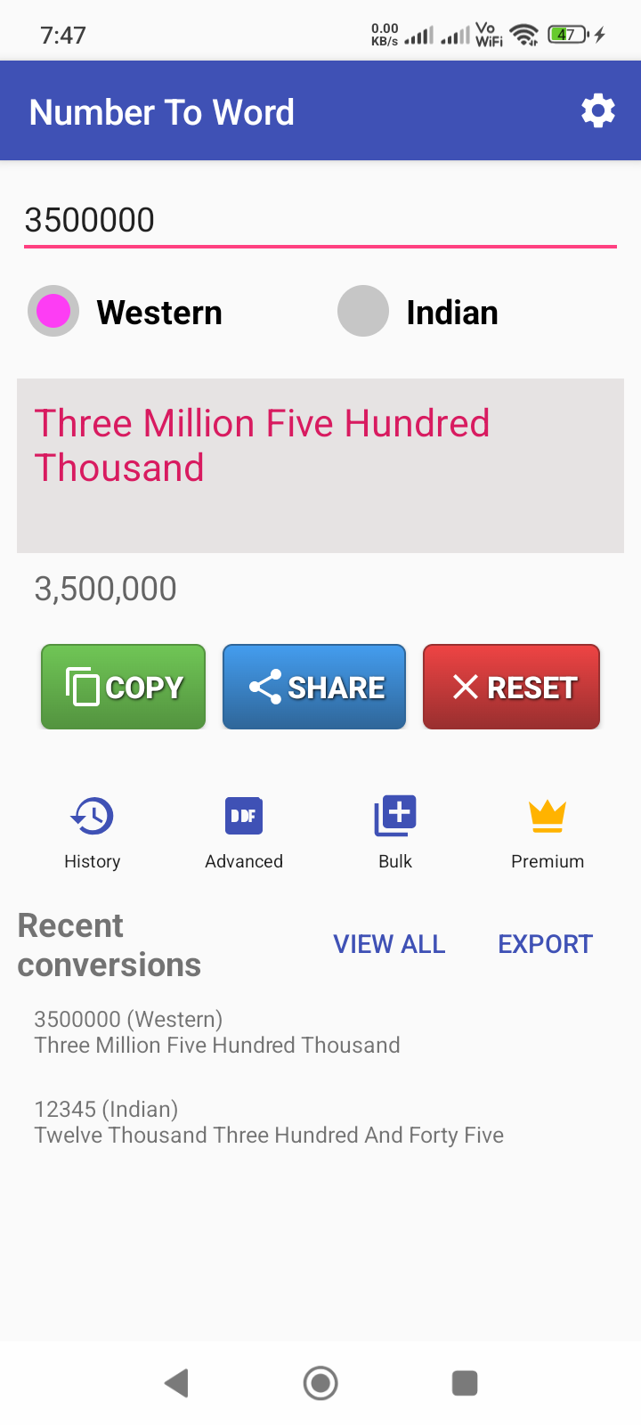 Convert any number into words instantly with Number To Word Converter — the most complete number-to-word tool on Google Play. Whether you need to write a cheque, fill out a legal document, or simply convert numbers for reference, this app handles it all with ease. CORE FEATURES ● Number to Word — Convert any number into English words in real time as you type ● Word to Number — Reverse convert words back into numbers ● Western Format — Standard international numbering (million, billion, trillion) ● Indian Format — Indian numbering system (lakh, crore, arab, kharab) with support for up to 41 digits ● Currency Mode — Convert amounts to currency words with proper units for USD ($), INR (₹), GBP (£) and EUR (€) ● Decimal Support — Handles decimal numbers accurately ● Number Formatting — Displays formatted numbers with correct comma placement (Western and Indian styles) BULK CONVERSION ● Enter multiple numbers at once, one per line ● Convert all numbers in a single tap ● Copy all results to clipboard ● Export results as Text, CSV or PDF CONVERSION HISTORY ● All conversions saved automatically ● View, search and manage your conversion history ● Swipe to delete individual entries ● Tap any entry to copy it ● Export history as Text or PDF EXPORT & SHARE ● Share conversions via WhatsApp, email or any messaging app ● Export as formatted text ● Export as CSV for spreadsheets ● Export as professional PDF documents DARK MODE ● Full dark theme support ● Choose Light, Dark or follow your system setting PREMIUM (Optional One-Time Purchase) ● Remove all ads permanently ● Unlimited conversion history ● PDF export for history and bulk conversions ● Lifetime access — pay once, no subscriptions DESIGNED FOR EVERYDAY USE ● Clean, modern card-based interface ● Real-time conversion as you type ● Haptic feedback on actions ● Works completely offline ● Lightweight and fast Perfect for accountants, bankers, students, teachers, lawyers, and anyone who needs accurate number-to-word conversions. Download Number To Word Converter now — the easiest way to convert numbers to words.