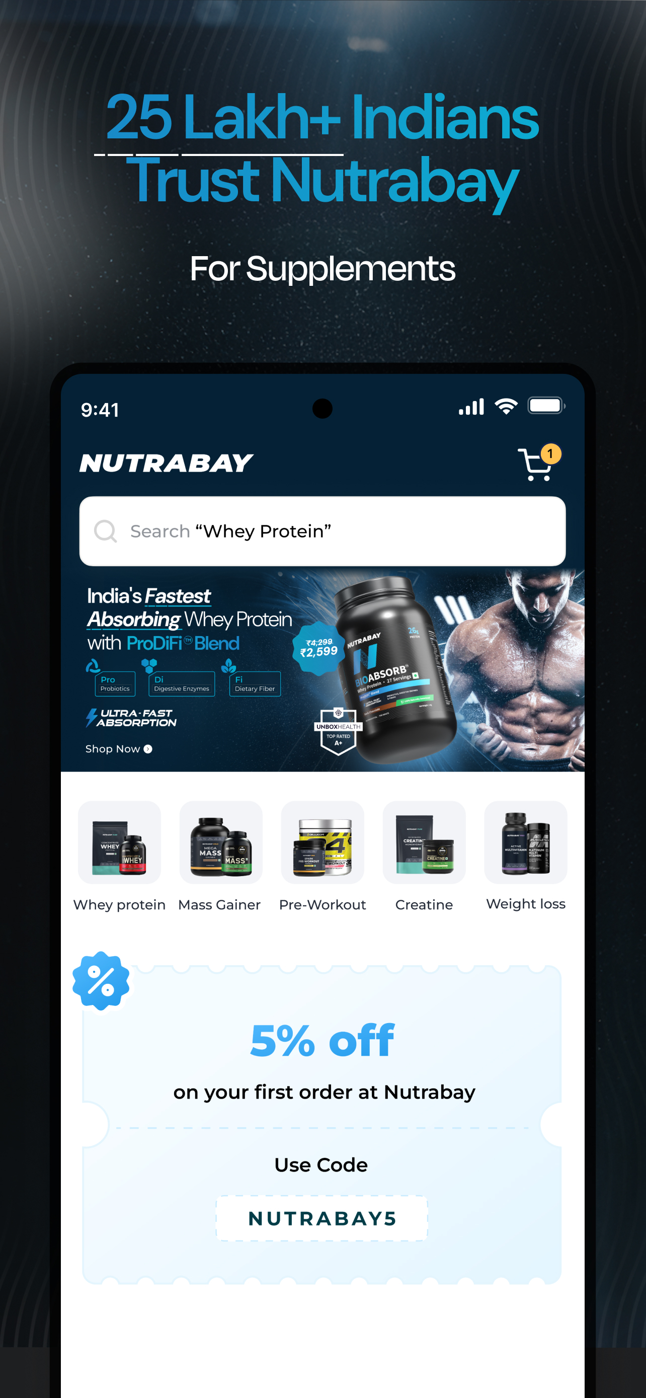 Get all your fitness supplement from Nutrabay - your one-stop shop for supplements and nutrition. Whether you are looking for renowned local or international brands, Nutrabay is the best protein app and best app to buy supplements that offer a range of genuine products to help you with all your fitness and health goals. Trust built since 2017 The fastest-growing online sports nutrition and supplement store in India with experience built over the last 5 years, Nutrabay assures you of 🌟 100% original supplements 🌟 Certified by brands, with original authenticity certificates 🌟 Directly sourced with optimal quality checks 🌟 Secure packaging to prevent contamination and preserve quality until you open it 🌟 Fast and free shipping, no matter where in India 🌟 Regular discounts and offers for loyal customers All your choices are available on Nutrabay, one of the best apps for supplements Regardless of your healthcare and fitness concerns, Nutrabay has a catalog of over 5000 products to help you meet your fitness goals. ☑️ Protein supplements (whey protein isolates and whey protein concentrates) ☑️ Mass gainer supplements ☑️ Pre-workout and post-workout supplements ☑️ Protein powders (including vegan protein powder) ☑️ Creatine supplements (creatine monohydrate) ☑️ Multivitamins ☑️ BCAAs ☑️ Fat burners ☑️ Protein snacks ☑️ Ayurvedic supplements ☑️ Other health foods and supplements ☑️ Accessories ☑️ Fish oils ☑️ Skin care supplements Why Nutrabay is among the best nutrition apps for you 💪 More than 5000 products to choose from Nutrabay has every health supplement you can want from any brand, local or international. This means whatever your health goals may be, there is the desired supplement for it in the product catalog for you to choose from. 💪 Easy to use: The app is very easy to use. Whenever you need to search for anything, you can either use the “Menu” option or the search bar on top to search for the category of supplement, the product name, or the brand. This simple design ensures you can spend less time placing your order and more time working out to get your dream physique. 💪 Curated Nutrabay products: You can use the app to get your hands on Nutrabay’s range of supplements and health products. Curated with the health-conscious in mind, Nutrabay’s range of products follows all health protocols to ensure your journey toward your dream physique is optimally supplemented by the correct nutrients. 💪 Access to informational blogs and infographics: The Nutrabay app makes it easy to stay updated on the latest health trends. With informative blogs and infographics, you do not have to go anywhere else to get information on healthcare tips and trends. 💪 Secure financial transactions: The app is integrated to ensure quick and secure checkouts. Compatible with payments with Google Pay, Amazon Pay, debit cards, credit cards, wallet payments, EMIs, and even COD. 💪 Fair prices to make health affordable: Nutrabay offers original products at fair and reasonable prices. This ensures that you can easily get your desired supplements at affordable rates without any worry. 💪 Frequent offers for loyal customers: The app hosts frequent offers that you can take advantage of to get the most out of your Nutrabay orders. In addition to discount offers, the app also runs freebie offers to give you product samples, gym gloves, shakers, gym bags, t-shirts, and more on selected products! Nutrabay is for you if you want to give your body all the right nutrients to stay in the desired shape, be it mass gainers, creatine powder, protein bars, including plant protein, multivitamin supplements, or anything else. So, download Nutrabay: Supplements Store, the optimum nutrition app and supplement shopping app, and give your body the gift of optimal nutrition. Visit us on the web to learn more: https://nutrabay.com