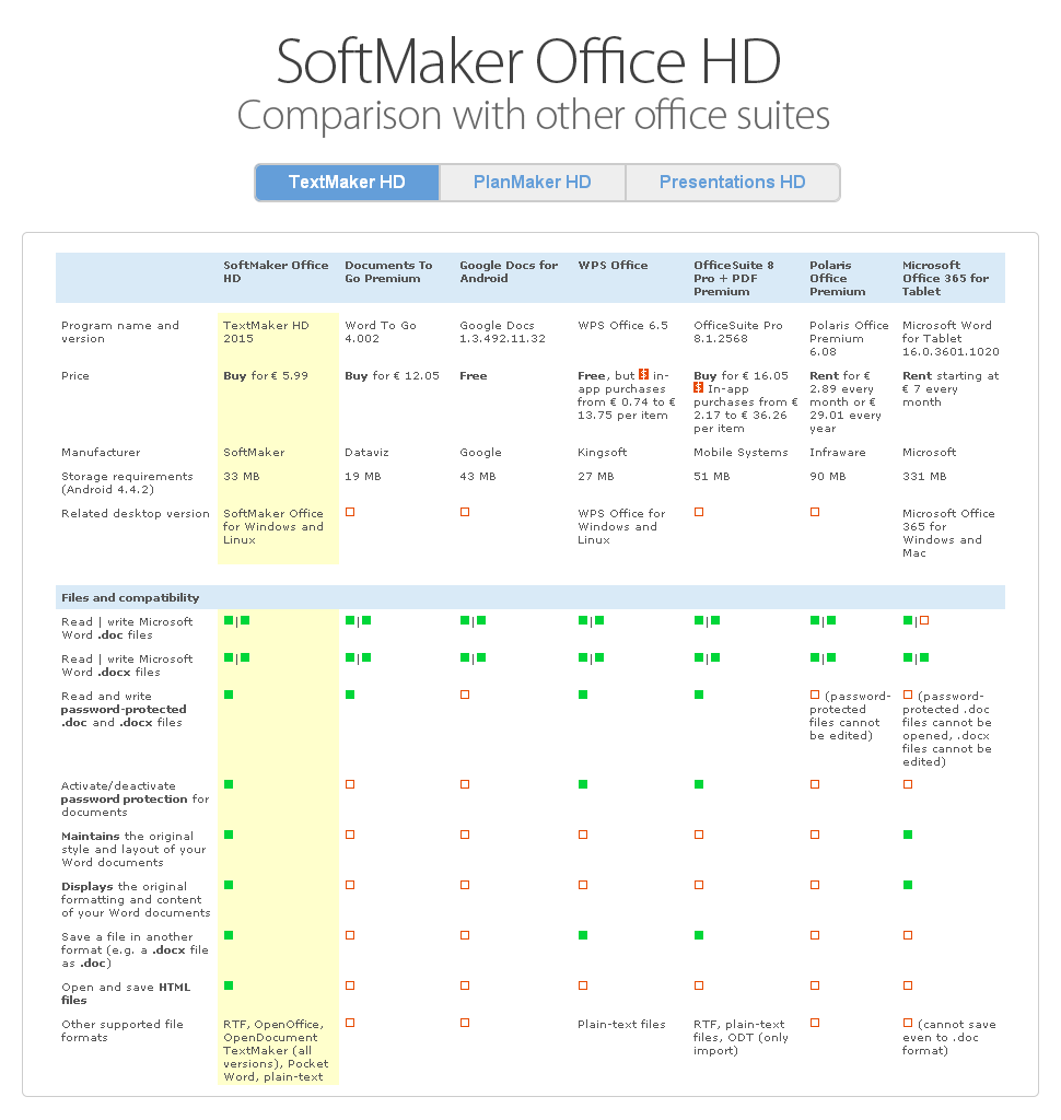 Office HD: TextMaker TRIAL (Package Name: softmaker.applications.textmaker.hdtrial) is developed by SoftMaker Software GmbH and the latest version of Office HD: TextMaker TRIAL 2016.767.0623 was updated on June 27, 2017. Office HD: TextMaker TRIAL is in the category of Business. You can check all apps from the developer of Office HD: TextMaker TRIAL. Currently this app is for free. This app can be downloaded on Android 4.0+ on APKFab or Google Play. All APK/XAPK files on APKFab.com are original and 100% safe with fast download.